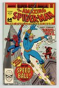 $9.50Direct Edition. "Drug War Rages" Guest-starring Daredevil and Speedball. Part 5 of the Evolutionary War storyline. First appearance of Speedball. Plot by Tom DeFalco. Script by David Michelinie. Pencils by Mark Bagley. Inks by Mike Esposito. Cover by Ron Frenz and Joe Rubinstein. What begins as a simple drug bust in a west side warehouse...escalates into a battle atop the Empire State Building to save the lives of everyone in the Big Apple! Along the way the Amazing Spider-Man teams up with a familiar ally, the Man Without Fear; and meets a new superhero: Speedball (aka Robbie Baldwin)! The High Evolutionary wants to sterilize New York's population to eradicate DNA strands deemed to be undesirable! Can the web-slinger, Daredevil, and Speedball defeat the Purifiers and maintain the gene pool status quo? The Evolutionary War storyline continues in Fantastic Four Annual 21. Appearances by the Kingpin, Arranger, Madeline Naylor, Mary Jane Watson, Ben Urich, and J. Jonah Jameson. First backup story: "He Who Laughs..." Plot by Steve Ditko. Script by Roger Stern. Pencils by Steve Ditko. Inks by Jackson Guice. Speedball battles a crazy stagehand seeking revenge against his mother. Second backup story: "Kindred Spirits" Story by Mark Gruenwald. Pencils by Ron Lim. Inks by Tony DeZuniga. Chapter 6 of the High Evolutionary's history. Inside his Wundagore Mountain citadel, Edgar Wyndham creates Bova -- the future nanny of Quicksilver and the Scarlet Witch; and foolishly ignores Magnus' warning that the spirit of Chthon is bound to Wundagore Mountain. First backup feature: Spider-Man and J. Jonah Jameson pin-up by Larry Lieber and Frank Giacoia. Second backup feature: 2-page diagram of Peter and Mary Jane's Bedford Towers apartment. Third backup feature: Two unpublished Amazing Spider-Man covers -- the first by Larry Lieber & Jack Abel; the second by Bob Layton. (Note: Fantastic Four Annual 21 is the 6th part of the Evolutionary War storyline, but the 5th chapter of the history presented in the backup stories.) 68 pages. Cover price $1.75.