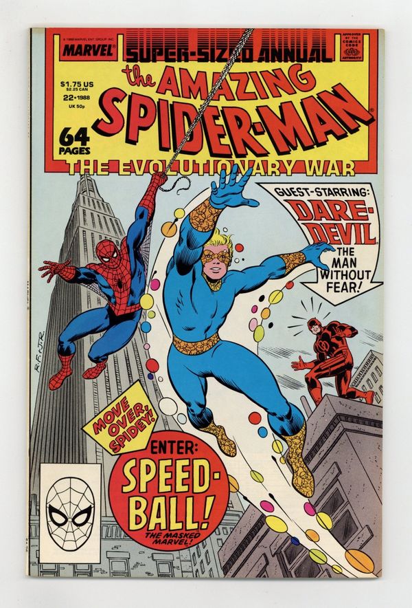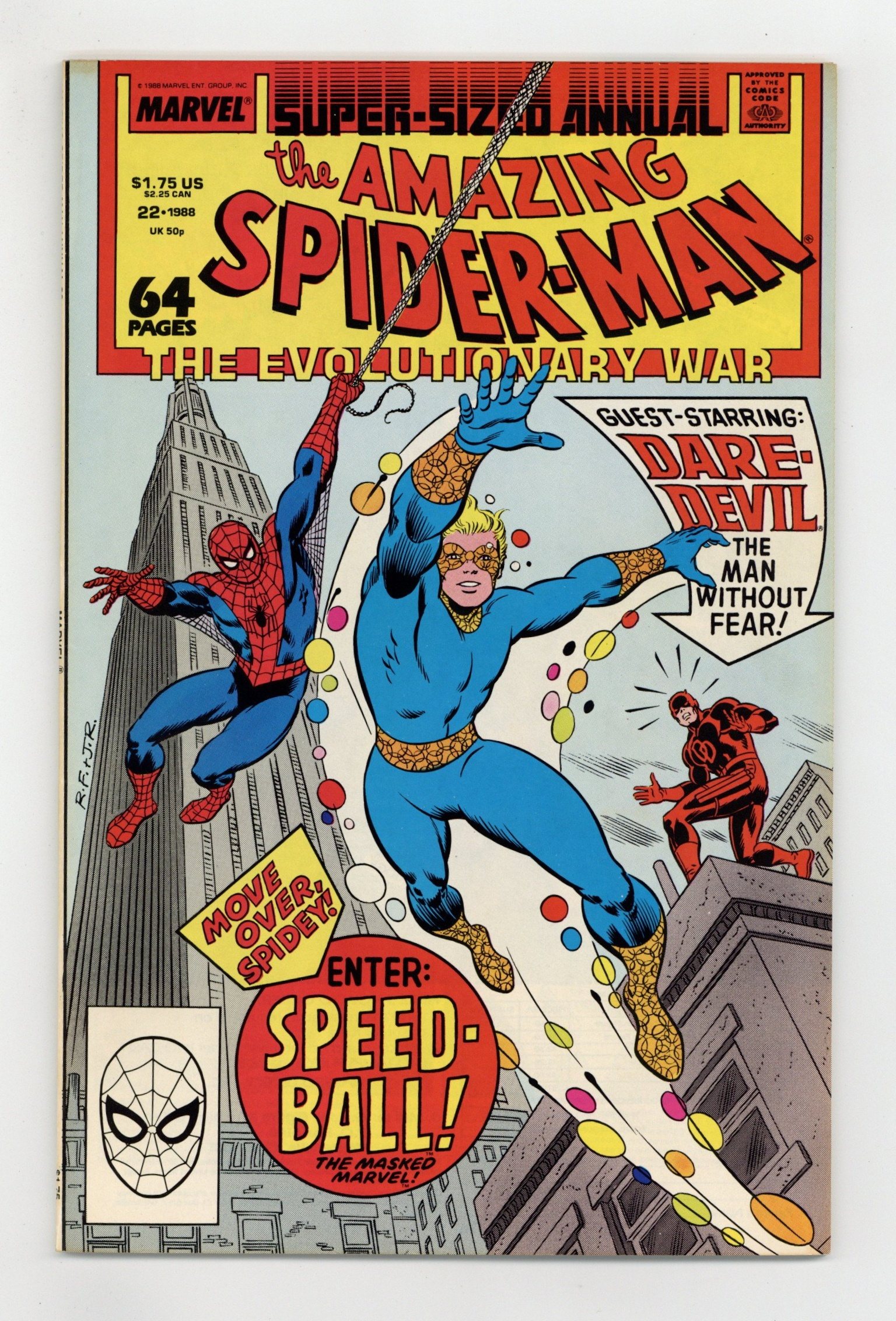 $14.50"Drug War Rages" Guest-starring Daredevil and Speedball. Part 5 of the Evolutionary War storyline. First appearance of Speedball. Plot by Tom DeFalco. Script by David Michelinie. Pencils by Mark Bagley. Inks by Mike Esposito. Cover by Ron Frenz and Joe Rubinstein. What begins as a simple drug bust in a west side warehouse...escalates into a battle atop the Empire State Building to save the lives of everyone in the Big Apple! Along the way the Amazing Spider-Man teams up with a familiar ally, the Man Without Fear; and meets a new superhero: Speedball (aka Robbie Baldwin)! The High Evolutionary wants to sterilize New York's population to eradicate DNA strands deemed to be undesirable! Can the web-slinger, Daredevil, and Speedball defeat the Purifiers and maintain the gene pool status quo? The Evolutionary War storyline continues in Fantastic Four Annual 21. Appearances by the Kingpin, Arranger, Madeline Naylor, Mary Jane Watson, Ben Urich, and J. Jonah Jameson. First backup story: "He Who Laughs..." Plot by Steve Ditko. Script by Roger Stern. Pencils by Steve Ditko. Inks by Jackson Guice. Speedball battles a crazy stagehand seeking revenge against his mother. Second backup story: "Kindred Spirits" Story by Mark Gruenwald. Pencils by Ron Lim. Inks by Tony DeZuniga. Chapter 6 of the High Evolutionary's history. Inside his Wundagore Mountain citadel, Edgar Wyndham creates Bova -- the future nanny of Quicksilver and the Scarlet Witch; and foolishly ignores Magnus' warning that the spirit of Chthon is bound to Wundagore Mountain. First backup feature: Spider-Man and J. Jonah Jameson pin-up by Larry Lieber and Frank Giacoia. Second backup feature: 2-page diagram of Peter and Mary Jane's Bedford Towers apartment. Third backup feature: Two unpublished Amazing Spider-Man covers -- the first by Larry Lieber & Jack Abel; the second by Bob Layton. (Note: Fantastic Four Annual 21 is the 6th part of the Evolutionary War storyline, but the 5th chapter of the history presented in the backup stories.) 68 pages. Cover price $1.75.