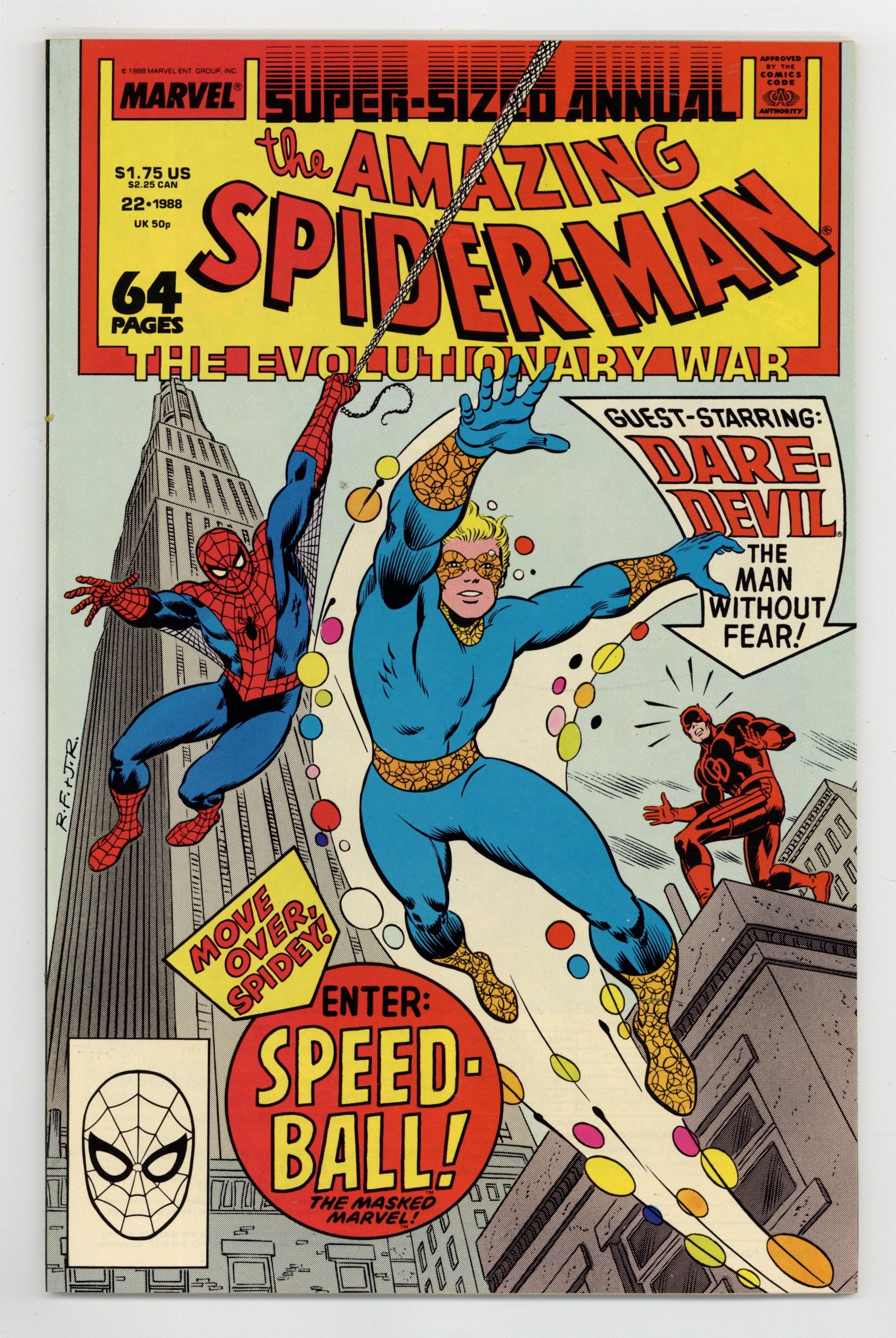 $7.30Direct Edition. "Drug War Rages" Guest-starring Daredevil and Speedball. Part 5 of the Evolutionary War storyline. First appearance of Speedball. Plot by Tom DeFalco. Script by David Michelinie. Pencils by Mark Bagley. Inks by Mike Esposito. Cover by Ron Frenz and Joe Rubinstein. What begins as a simple drug bust in a west side warehouse...escalates into a battle atop the Empire State Building to save the lives of everyone in the Big Apple! Along the way the Amazing Spider-Man teams up with a familiar ally, the Man Without Fear; and meets a new superhero: Speedball (aka Robbie Baldwin)! The High Evolutionary wants to sterilize New York's population to eradicate DNA strands deemed to be undesirable! Can the web-slinger, Daredevil, and Speedball defeat the Purifiers and maintain the gene pool status quo? The Evolutionary War storyline continues in Fantastic Four Annual 21. Appearances by the Kingpin, Arranger, Madeline Naylor, Mary Jane Watson, Ben Urich, and J. Jonah Jameson. First backup story: "He Who Laughs..." Plot by Steve Ditko. Script by Roger Stern. Pencils by Steve Ditko. Inks by Jackson Guice. Speedball battles a crazy stagehand seeking revenge against his mother. Second backup story: "Kindred Spirits" Story by Mark Gruenwald. Pencils by Ron Lim. Inks by Tony DeZuniga. Chapter 6 of the High Evolutionary's history. Inside his Wundagore Mountain citadel, Edgar Wyndham creates Bova -- the future nanny of Quicksilver and the Scarlet Witch; and foolishly ignores Magnus' warning that the spirit of Chthon is bound to Wundagore Mountain. First backup feature: Spider-Man and J. Jonah Jameson pin-up by Larry Lieber and Frank Giacoia. Second backup feature: 2-page diagram of Peter and Mary Jane's Bedford Towers apartment. Third backup feature: Two unpublished Amazing Spider-Man covers -- the first by Larry Lieber & Jack Abel; the second by Bob Layton. (Note: Fantastic Four Annual 21 is the 6th part of the Evolutionary War storyline, but the 5th chapter of the history presented in the backup stories.) 68 pages. Cover price $1.75.