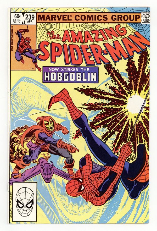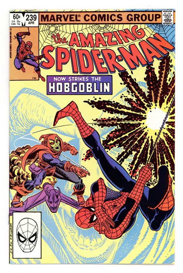 Tags: Marvel Legacy Numbering: Amazing Spider-Man (part 239), Spider-Man$17.00Direct Edition. "Now Strikes the Hobgoblin!" Second appearance of the Hobgoblin. Script by Roger Stern. Art by John Romita Jr. (breakdowns) and Frank Giacoia (finishes). Cover by John Romita Jr. and Al Milgrom. It's the first fight between the Hobgoblin and the Amazing Spider-Man! And the all-out action begins after the web-slinger bumps into the new goblin at one of Norman Osborn's old hideouts! Spidey is very familiar with the goblin's bag of tricks! But the overmatched Hobgoblin doesn't have any idea about the wall-crawler's speed, strength, and agility! Is the Hobgoblin's criminal career going to be over before it even starts? An outstanding issue! Cameo appearances by Harry Osborn, Madame Web, Captain DeWolff, and the Black Cat. (Notes: The Hobgoblin returns in Amazing Spider-Man 244. This issue was reprinted in Marvel Tales 258.) 36 pages. Cover price $0.60.