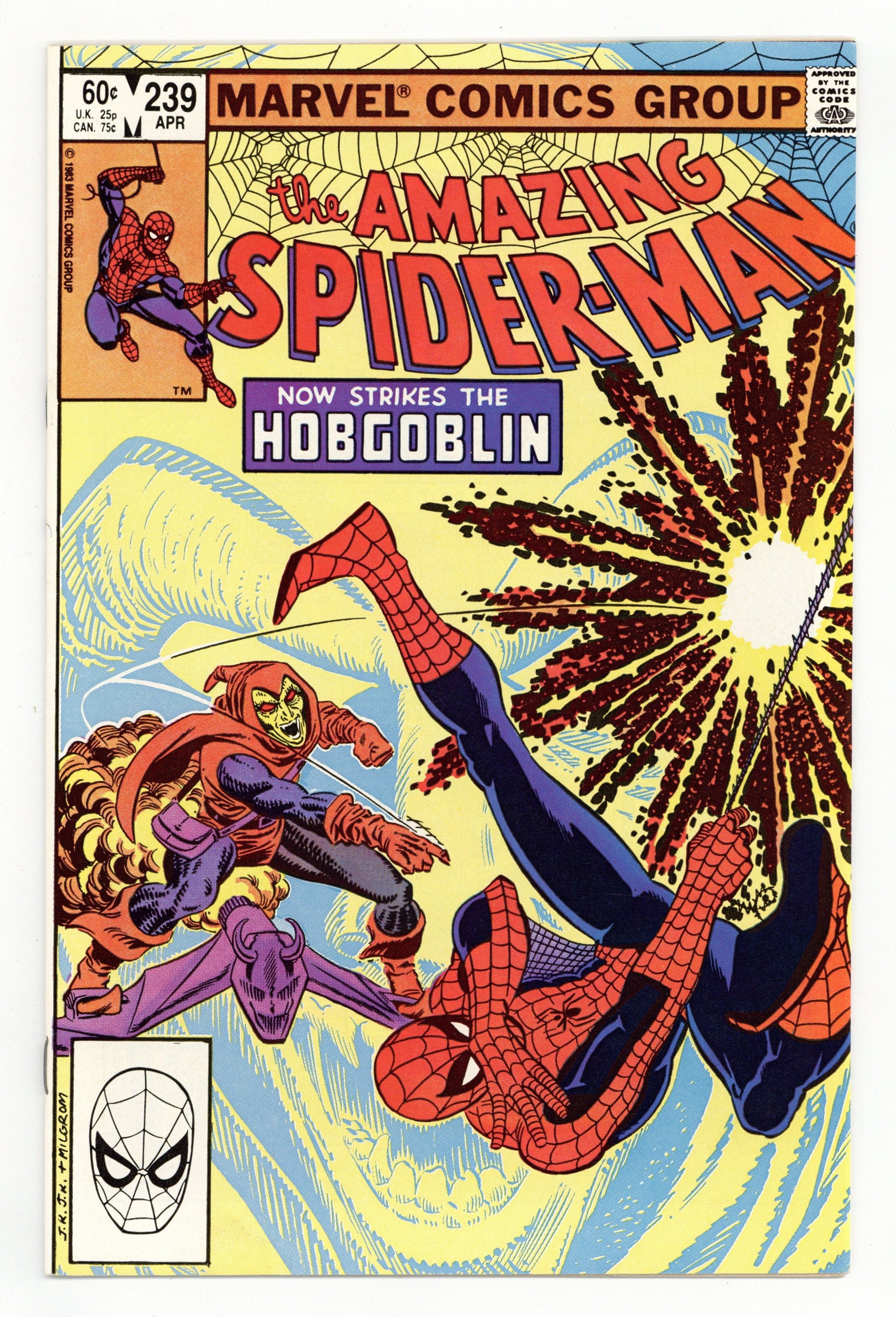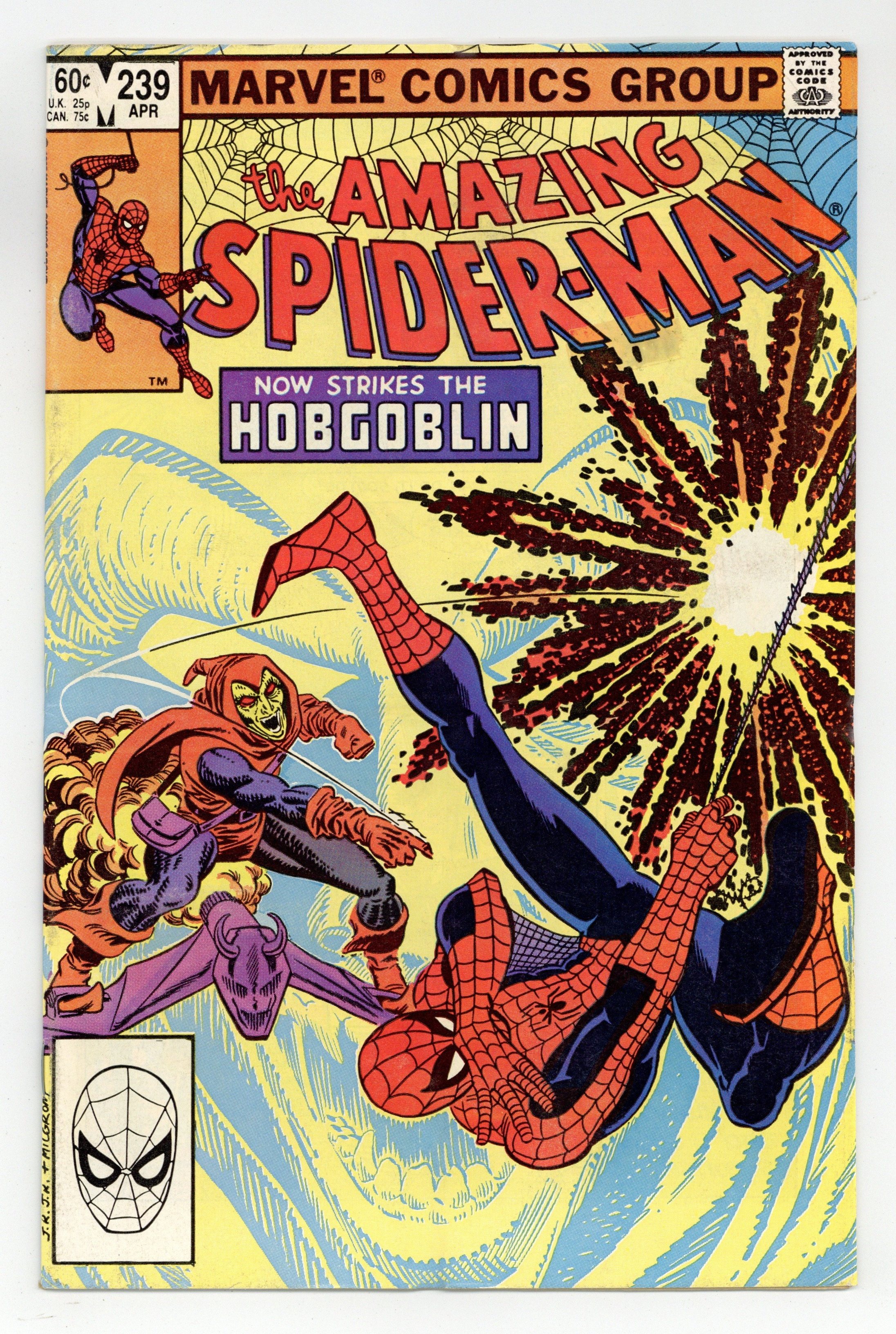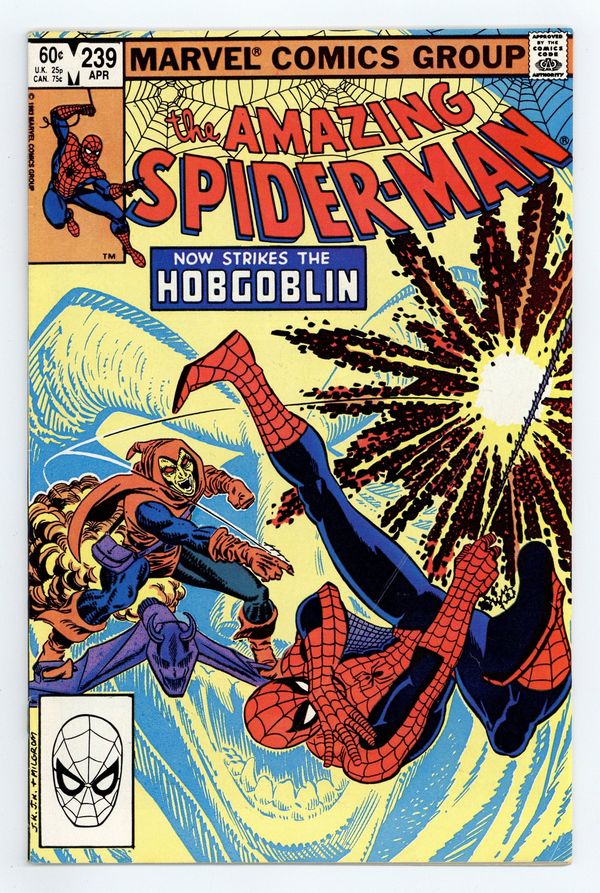 Direct Edition. "Now Strikes the Hobgoblin!" Second appearance of the Hobgoblin. Script by Roger Stern. Art by John Romita Jr. (breakdowns) and Frank Giacoia (finishes). Cover by John Romita Jr. and Al Milgrom. It's the first fight between the Hobgoblin and the Amazing Spider-Man! And the all-out action begins after the web-slinger bumps into the new goblin at one of Norman Osborn's old hideouts! Spidey is very familiar with the goblin's bag of tricks! But the overmatched Hobgoblin doesn't have any idea about the wall-crawler's speed, strength, and agility! Is the Hobgoblin's criminal career going to be over before it even starts? An outstanding issue! Cameo appearances by Harry Osborn, Madame Web, Captain DeWolff, and the Black Cat. (Notes: The Hobgoblin returns in Amazing Spider-Man 244. This issue was reprinted in Marvel Tales 258.) 36 pages. Cover price $0.60.