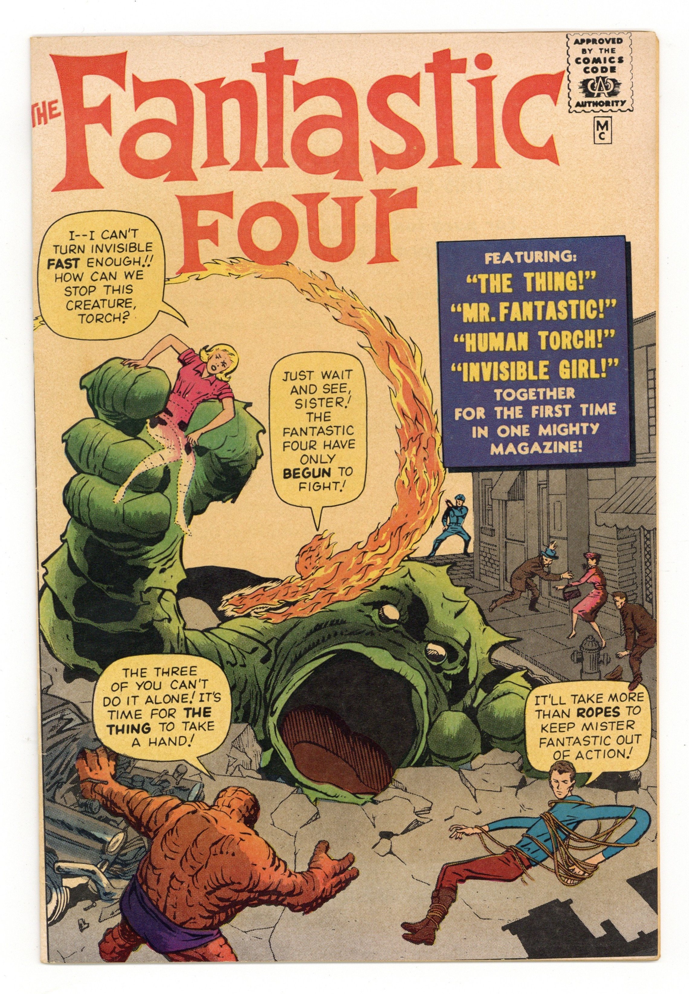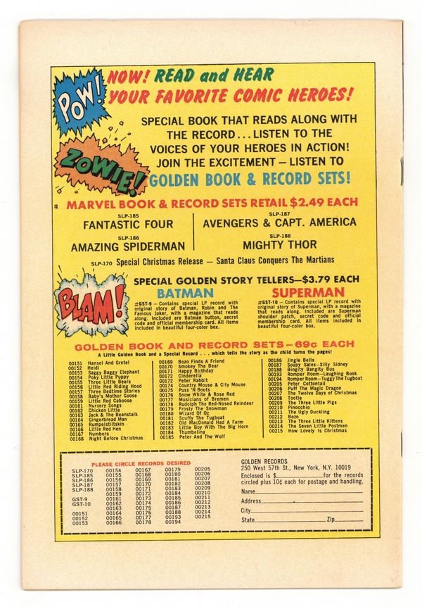 COMIC ONLY, NO RECORD - The Fantastic Four Golden Record Reprint (28-pages, full-color, standard comic format) was produced in 1966 and reprints Fantastic Four #1. Although the reprint, at first glance, looks like the original, there are differences. There is no cover price on the reprint, and the back cover, as well as the inside covers, promote the Golden Record LP series of which the Fantastic Four #1 is a part. The four Marvel Golden Record LPs came with a reprint comic, and each originally sold for $2.49 (record and comic together). In addition to the Fantastic Four LP, there were records produced for Thor (Journey into Mystery #83), Avengers #4; and Amazing Spider-Man #1, all with their own reprint comic. We bought these sets when they first appeared and can still remember following the story in the comic reprint while the record played and the narrator read the story to us. Just to make sure we didn't lose our place, he would say "Turn page," each time he finished the last panel on a page.