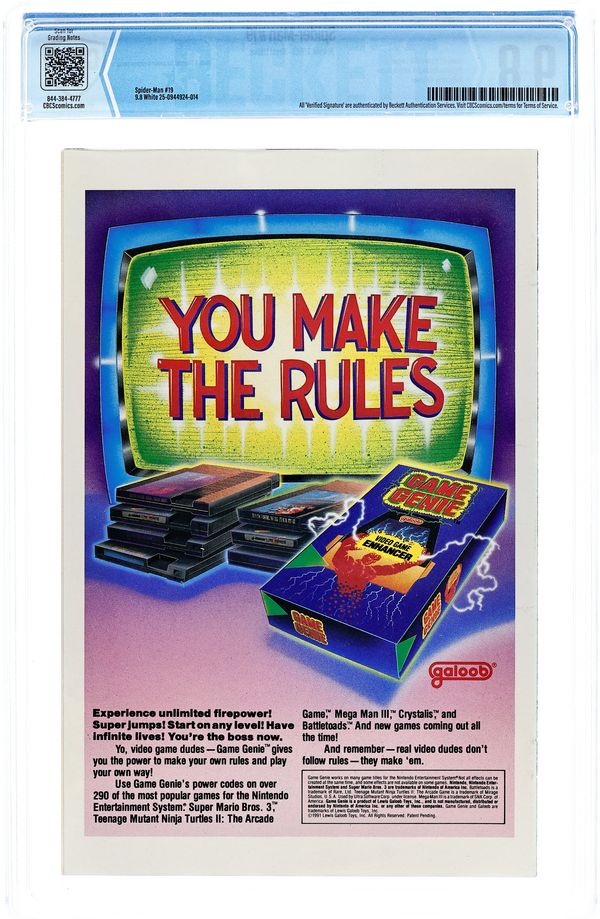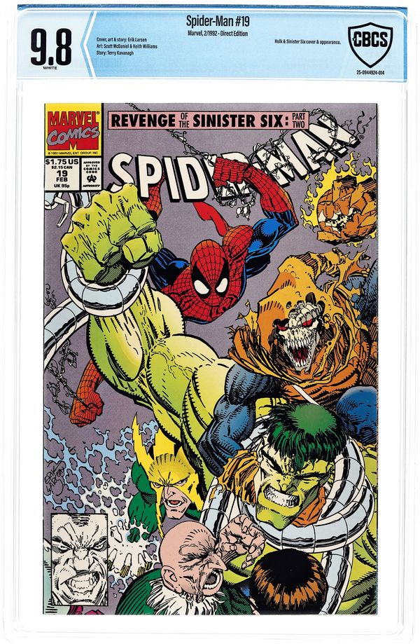 Revenge of the Sinister Six Part 2 of 6. "Slugfest" Guest-starring the Hulk. Script and art by Erik Larsen. Cover by Erik Larsen. Dr. Octopus' secret meeting with his former Sinister Six partners is interrupted by the wondrous wall-crawler! However the web-slinger and his secret ally -- the Sandman -- are seriously outnumbered! Luckily, another super-powered...actually gamma-powered...combatant enters the fray: the Hulk! Wow, Spider-Man and the Green Goliath should mop the floor with the Sinister Six! But Doc Ock's new adamantium arms are a game changer. Could Otto Octavius actually beat the Hulk? Second story: "Diabolique" Part 1 of 2. Script by Terry Kavanagh. Pencils by Scott McDaniel. Inks by Keith Williams. Peter and Mary Jane tour a new exhibit at the Metropolitan Museum of Art. But there is more to this ancient alchemy-based exhibit than meets the eye! 32 pages. Cover price $1.75.