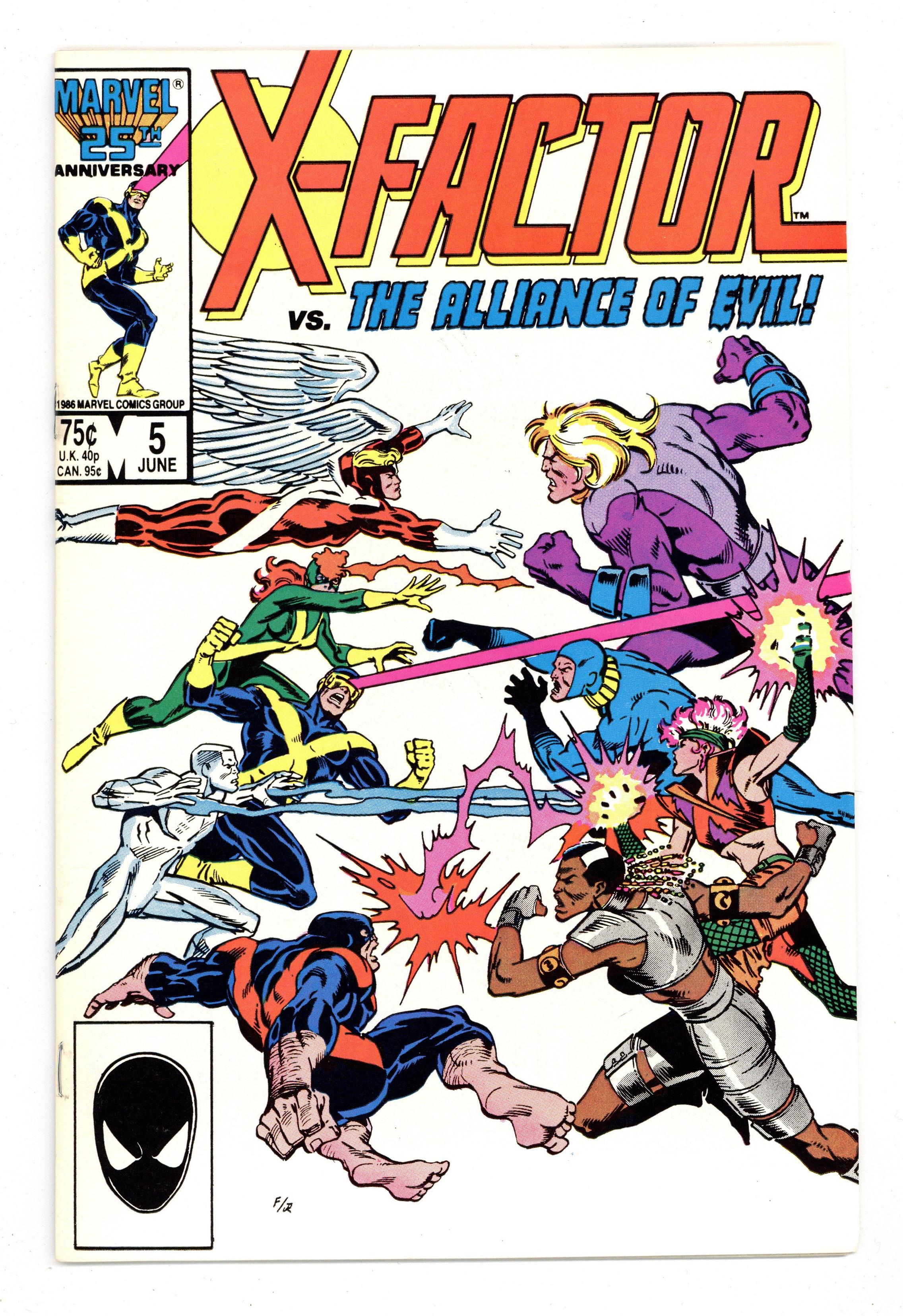 Direct Edition. "Tapped Out!" Part 1 of 2. 1st appearance of Apocalypse (shadowed cameo). Story by Bob Layton. Art by Jackson Guice and Joe Rubinstein. Cover by Ron Frenz and Joe Rubinstein. It's a classic super-hero/super-villain throw-down when X-Factor must battle the Alliance of Evil (Frenzy, Tower, Stinger, and Timeshadow) for the life of a mutant. Featuring a new menace by the name of Apocalypse, an evil mutant who will become a major thorn in the sides of the X-Men and X-Factor. Cover price $0.75.