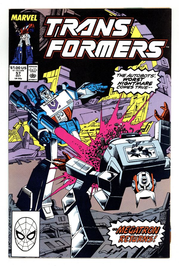 Megatron, who blew himself up back in issue #25, is back and has Ratchet prisoner in the Ark while Optimus Prime realizes that the attack on the air base was a ruse. And how did Megatraon survive that explosion? Find out in The Resurrection Gambit. Script by Simon Furman and art by Jose Delbo & Dave Hunt. Cover by Jose Delbo and Danny Bulanadi. Issue also has profile pages on Overkill and Slugfest Decepticons and Cloudraker Autobot. Cover price $1.00.