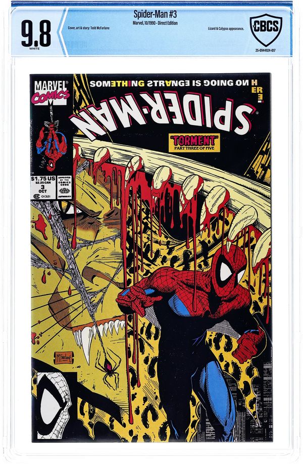 Direct Edition. Torment Part 3 of 5. "Something Strange is Going on Here!" Script and art by Todd McFarlane. Cover by Todd McFarlane. The Amazing Spider-Man and the Lethal Lizard wage war across the rooftops of Manhattan! Until the mysterious drums halt their fight! Who is controlling the pounding drums? The web-slinger better find out soon...or he won't make it through the night in one piece! Cameo appearance by Mary Jane Watson. (Note: This five-part story was reprinted in 1992 in the trade paperback: Spider-Man Torment; and again in 2009 in hardcover format.) 32 pages. Cover price $1.75.