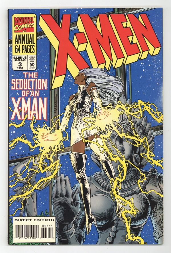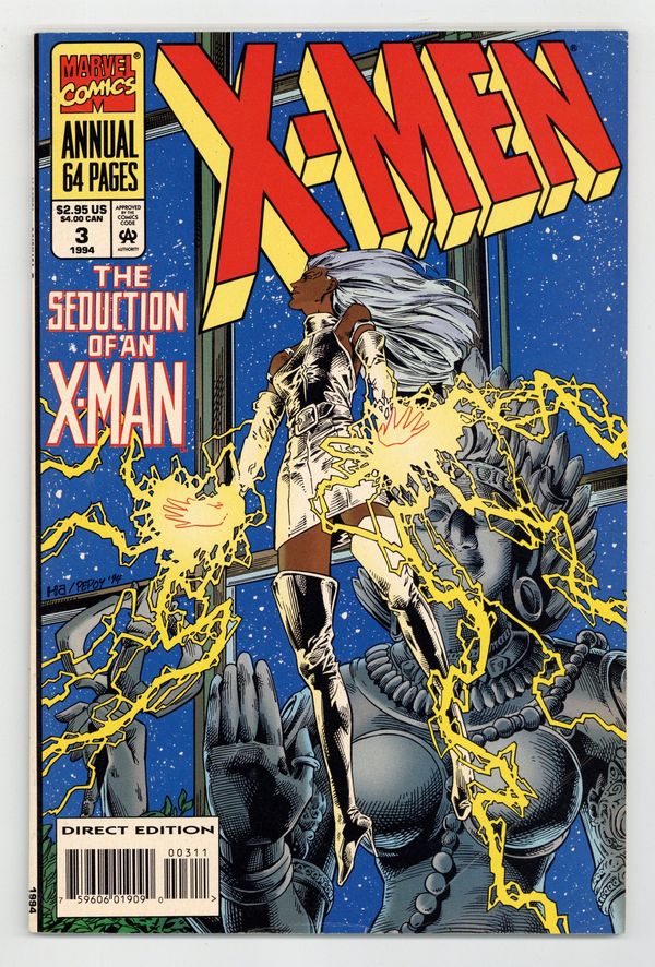 $9.50Storm stars in "Heart & Soul." Script by Ian Edginton, pencils by Gene Ha, inks by Joe Rubinstein, Dan Green, Bob Wiacek, Sellers, Pepoy, and Moy. "A Moment of Silence." Script by Jim Krueger, art by Steve Yowell. Pin-ups by Scott McDaniel, Neil McLuty, Jim Callahan/Kevin Conrad, Mark Pacella/Tom Palmer, Amanda Conner/Cam Smith, Bryan Lee, and Bryan Hitch. Ha/Pepoy cover. Cover price $2.95.