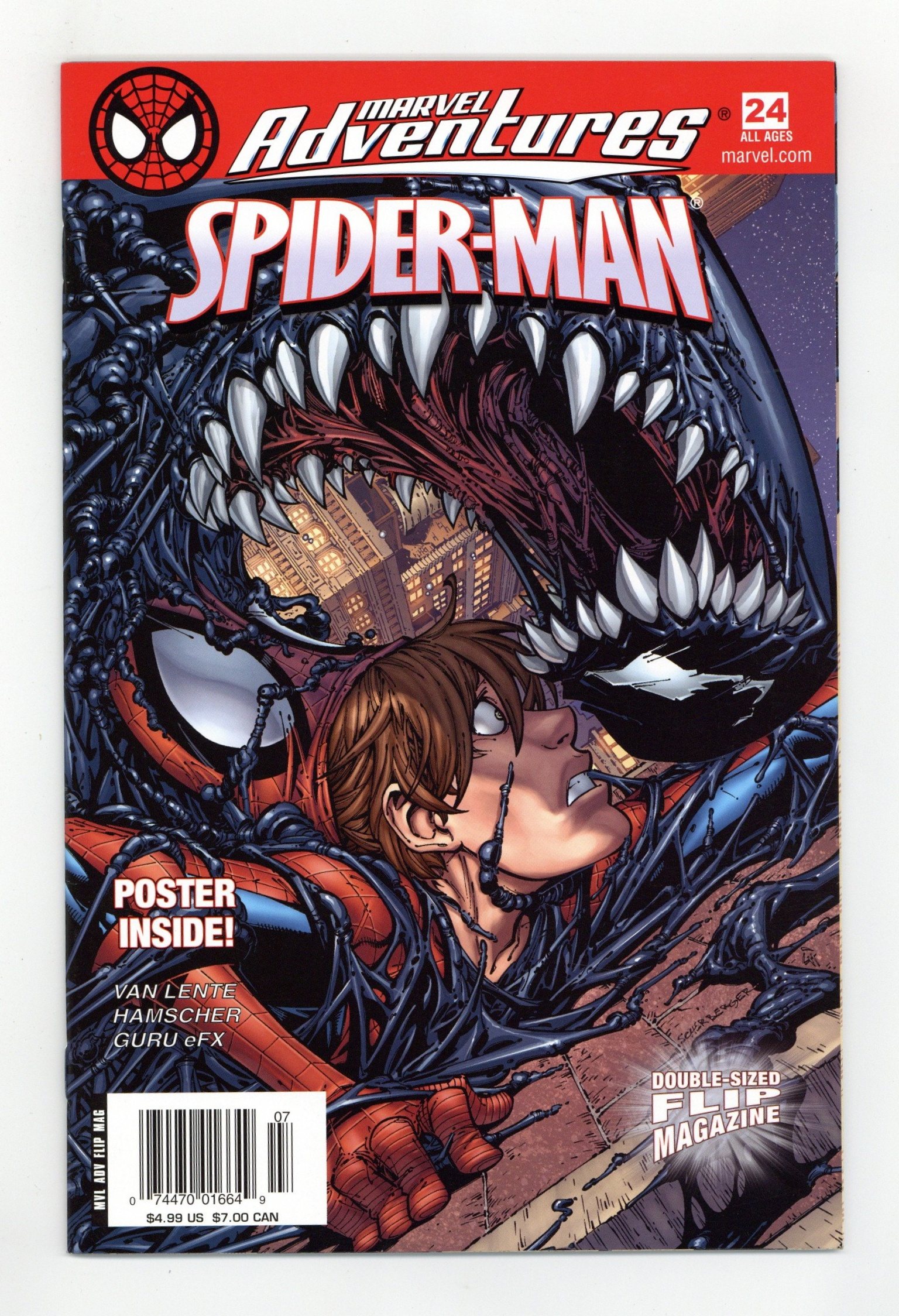 Written by FRED VAN LENTE. Penciled by CORY HAMSCHER. Cover by PATRICK SCHERBERGER. Featuring the fearsome debut of VENOM to the Adventures Universe! Spider-Man realizes he has to get rid of his new black costume -- but the costume isn't going to go without a fight! 32 PGS./All Ages Cover price $2.99.