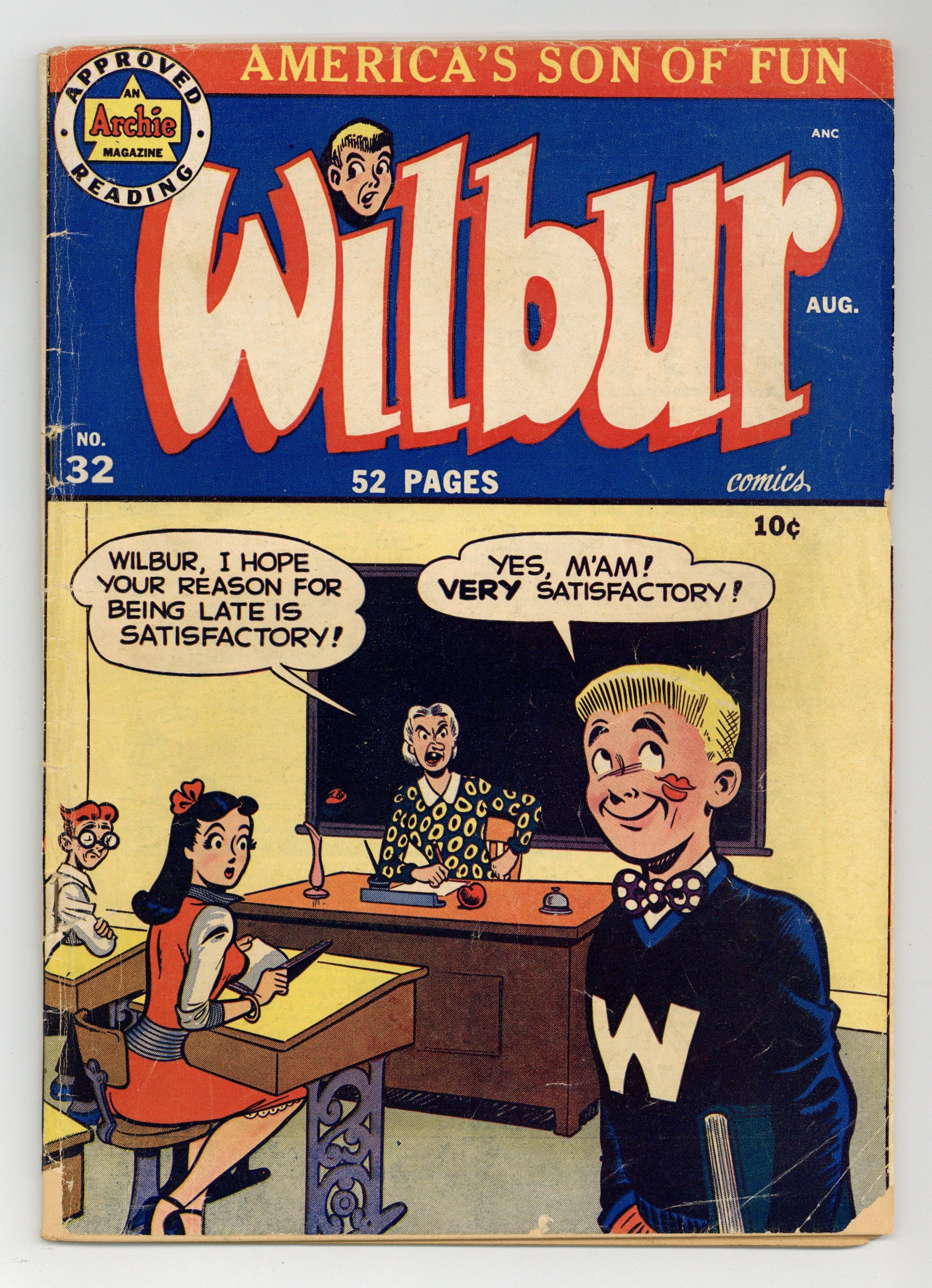 "Hit For Hat"; Wilbur tries to prove that men are better shoppers than women. "Funny Money"; Wilbur tries to get money for his date with Laurie. "Wilbur The Gentleman"; After reading about chivalry, Wilbur tries to act more chivalrous. Super Duck ad. "How To Win Friends!"; Wilbur has a popularity contest to see if he is more popular than Slats; It turns out he is-with a bunch of overweight women who chase him around the beach. Archie's Girls Betty and Veronica Comics ad. Untitled Katy Keene story, pencils by Bill Woggon; Katy has date trouble with K. O. and Randy. Katy Keene Sport Fashions cut-out page. 52 pgs., full color. $0.10. Cover price $0.10.