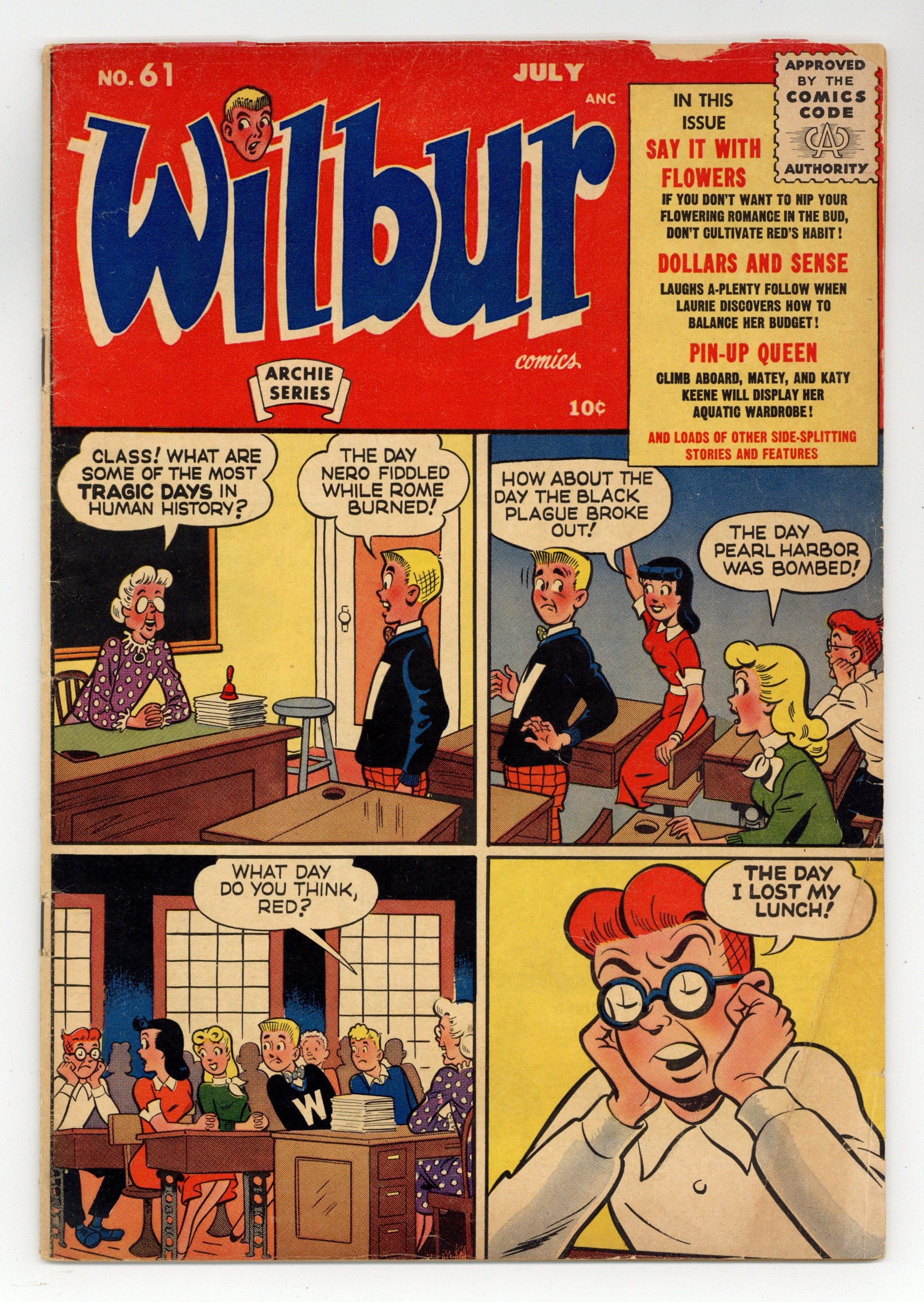 "Say It With Flowers"; Wilbur and Slats forgot their movie date with Linda and Laurie but Red has a plan to smooth things over. "How About a Date?"; Linda says yes to a date with Wilbur after Laurie turned him down. "Dollars and Sense"; Laurie figures out that she needs a bigger allowance. "Dreams"; Wilbur asks his friends about what careers they would like to have. "Sign Language"; Red helps Wilbur with poetry to impress Laurie. "Let Me Know"; Laurie suspects that Pamela is keeping a secret. Untitled story, script and art by Bill Woggon; Both Randy and K.O. ask Katy to go fishing on their boats. Katy Keene Fashions page by Bill Woggon. "The Big Move" text story; Linda is so excited by the news that Laurie is moving away, and she will have Wilbur all to herself. "Friendship"; Linda and Pamela are discussing the school dance and how much they resented Laurie's behavior. Archie Annual No. 7 house ad. "You Name It!"; Laurie congratulates a father who is taking his baby son for a ride in a carriage. "The Long and the Short of It"; Wilbur interviews Dripwaite, who bombards him with polysyllabic profundity. "Equal Partners"; Wilbur's dad is thinking of buying a new car. 36 pgs., full color. Cover price $0.10.