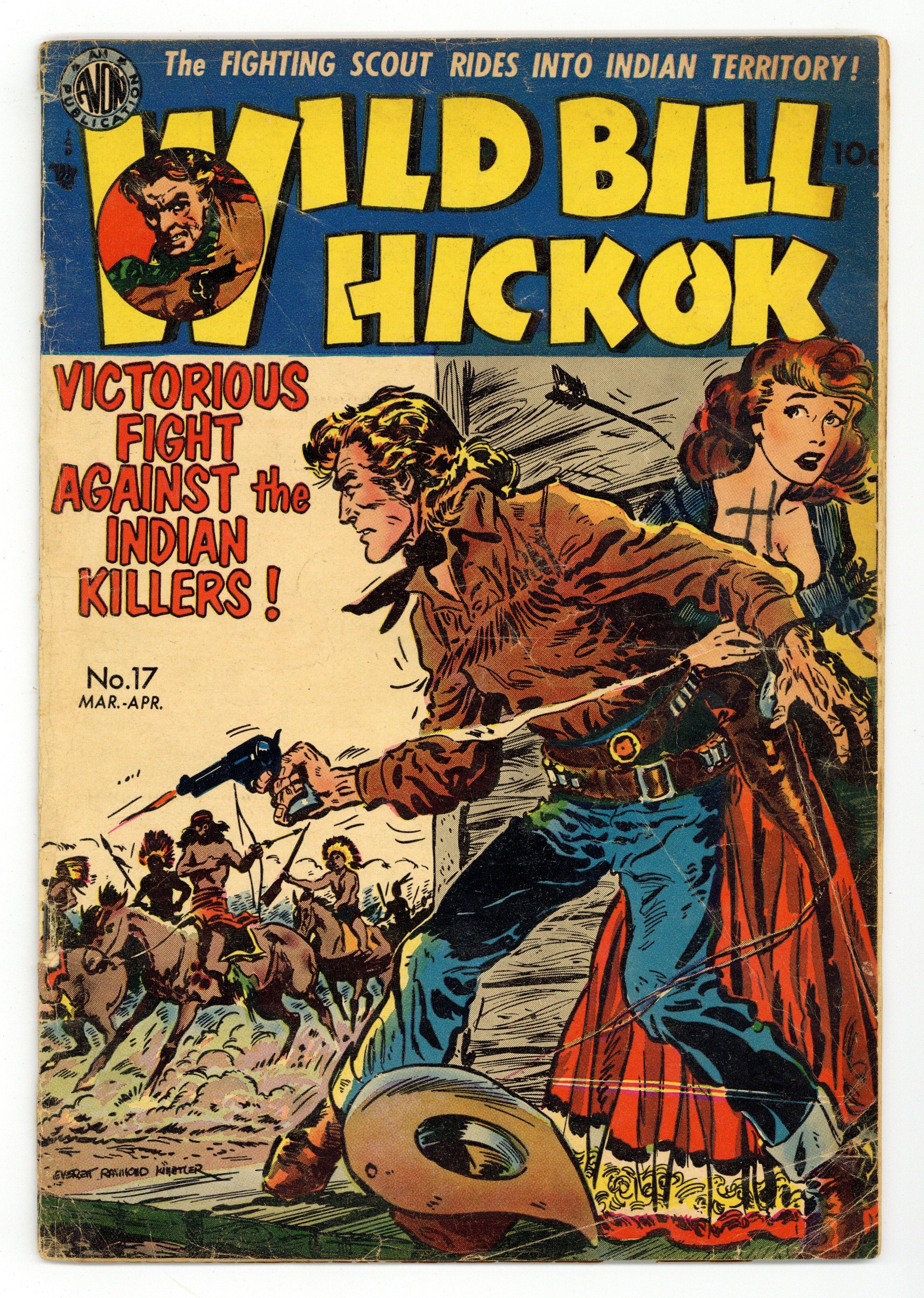 Cover art by Everett Raymond Kinstler. The Fight With The Killer Kiowas starring Wild Bill Hickok, art by Howard Larsen. The Ringtailed Roarer of the Wilderness starring Davy Crockett, art by Howard Larsen. Remember The Alamo starring Davy Crockett. The Law of the Plains text story. War Drums, art by Paul Reinman. 36 pgs. $0.10. Cover price $0.10.