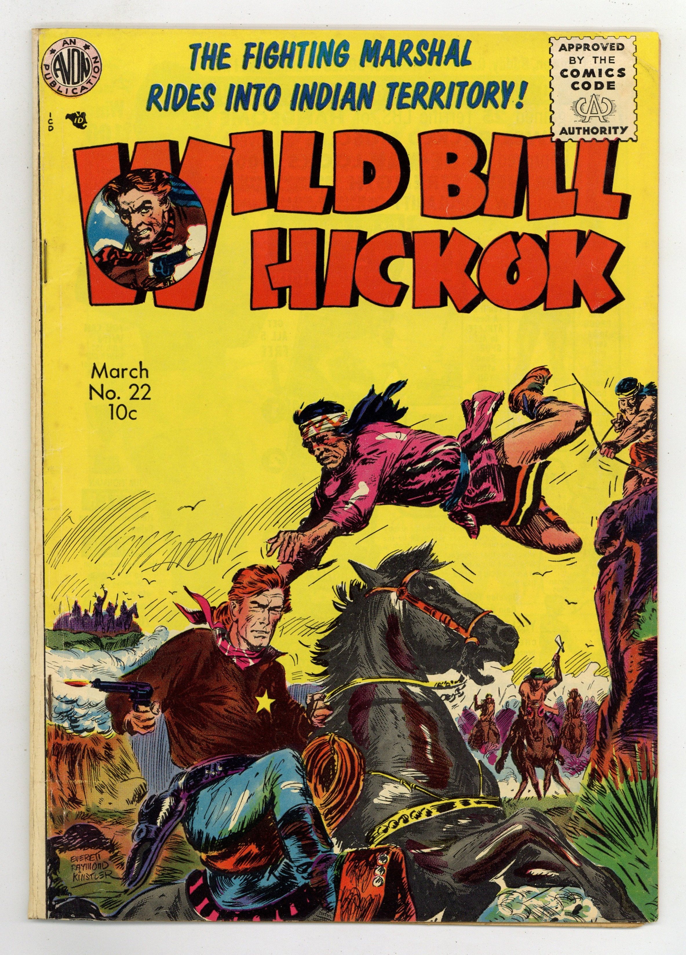 Published 1955 by Avon Publications.$17.50Cover art by Everett Raymond Kinstler. Along the Apache Trail starring Wild Bill Hickok, art by Howard Larsen. Queen of Eden starring The Fighting Parson (John Watkins), inks by Jon Small. Gun- Play In the Ghost Town text story. Cold Gold Or Hot Lead text story. Double In Knaves. Redskin Terror starring Geronimo, art by Gerald McCann. 36 pgs. $0.10. Cover price $0.10.