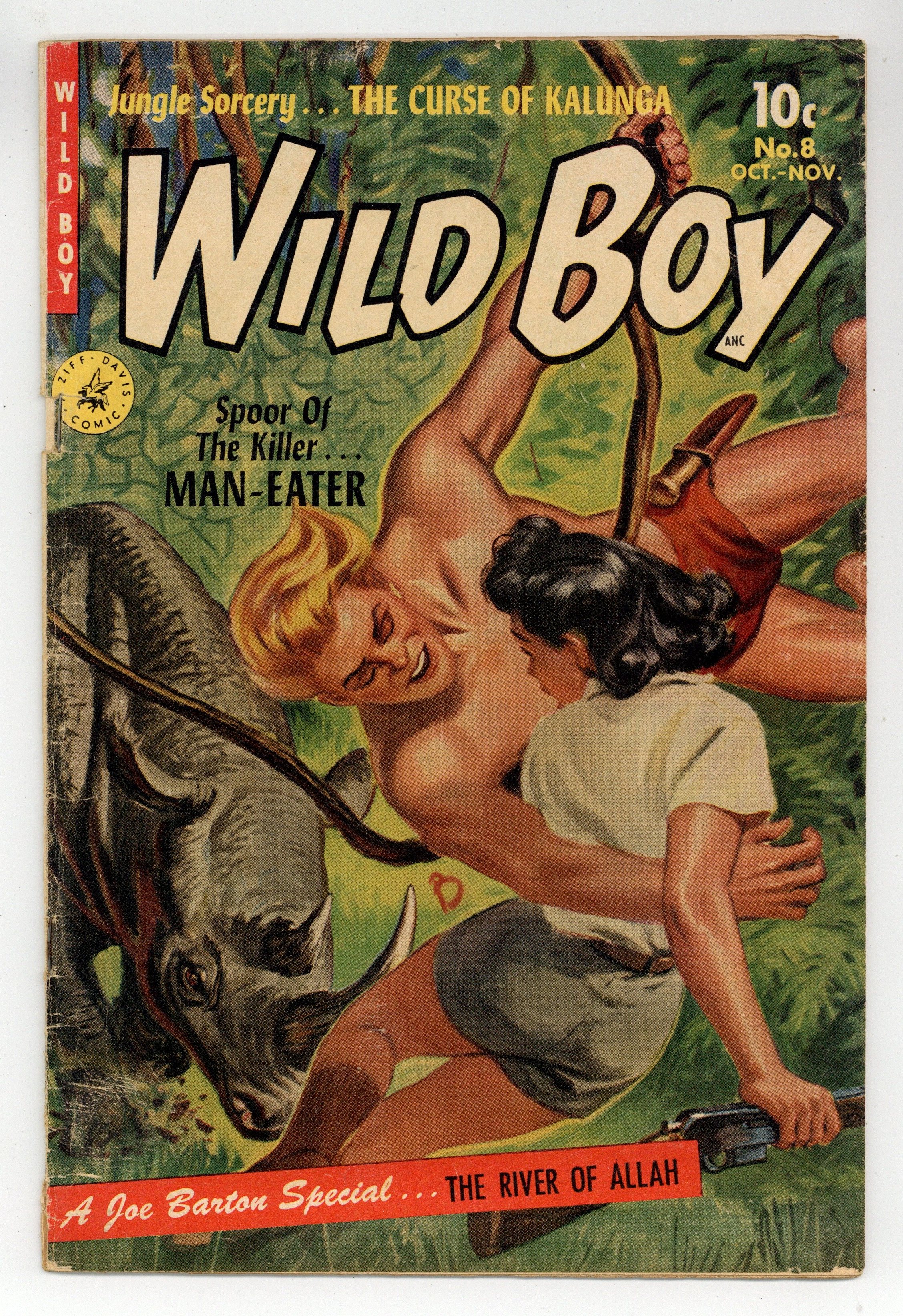 Painted cover art. G.I. Joe ad. "The Curse of Kalunga!"; The coward Wagabi changes into a reptile. "Man-Eater"; Rex Cutler is taking pictures of wild animals until Watibbi force him to leave the territory. "The Bird-Man Legend" text story. "The River of Allah," art by Irv Novick; Joe is hired by a fanatical man to guide him on a holy mission to find the river of Allah. Kid Cowboy ad. "Giants of the Jungle"; Wild Boy must win a contest of running, jumping and throwing to free his friend Keeto from the Wattusi tribe. 36 pgs., full color. $0.10. Cover price $0.10.