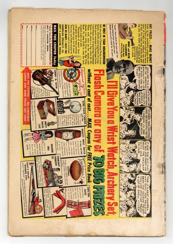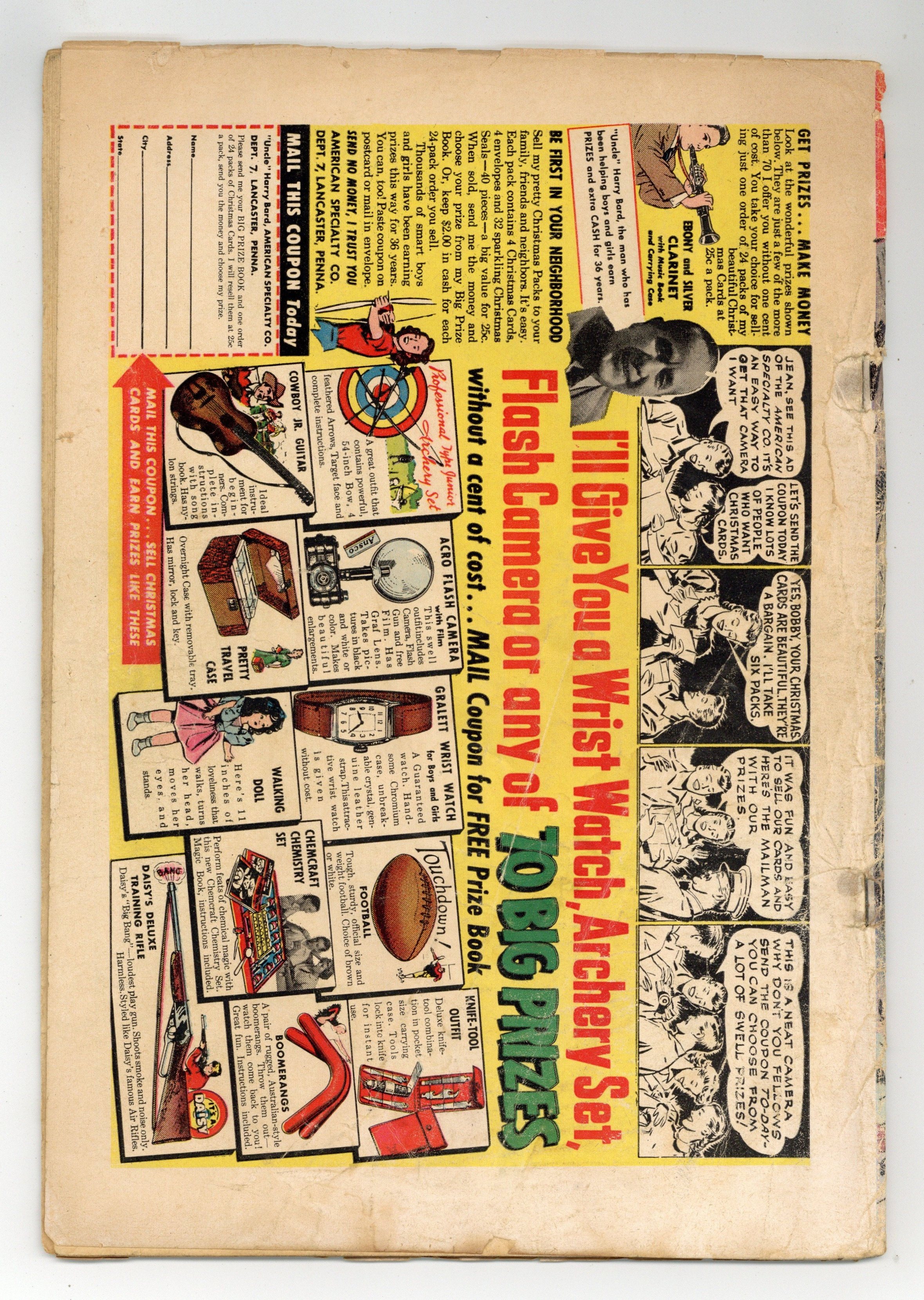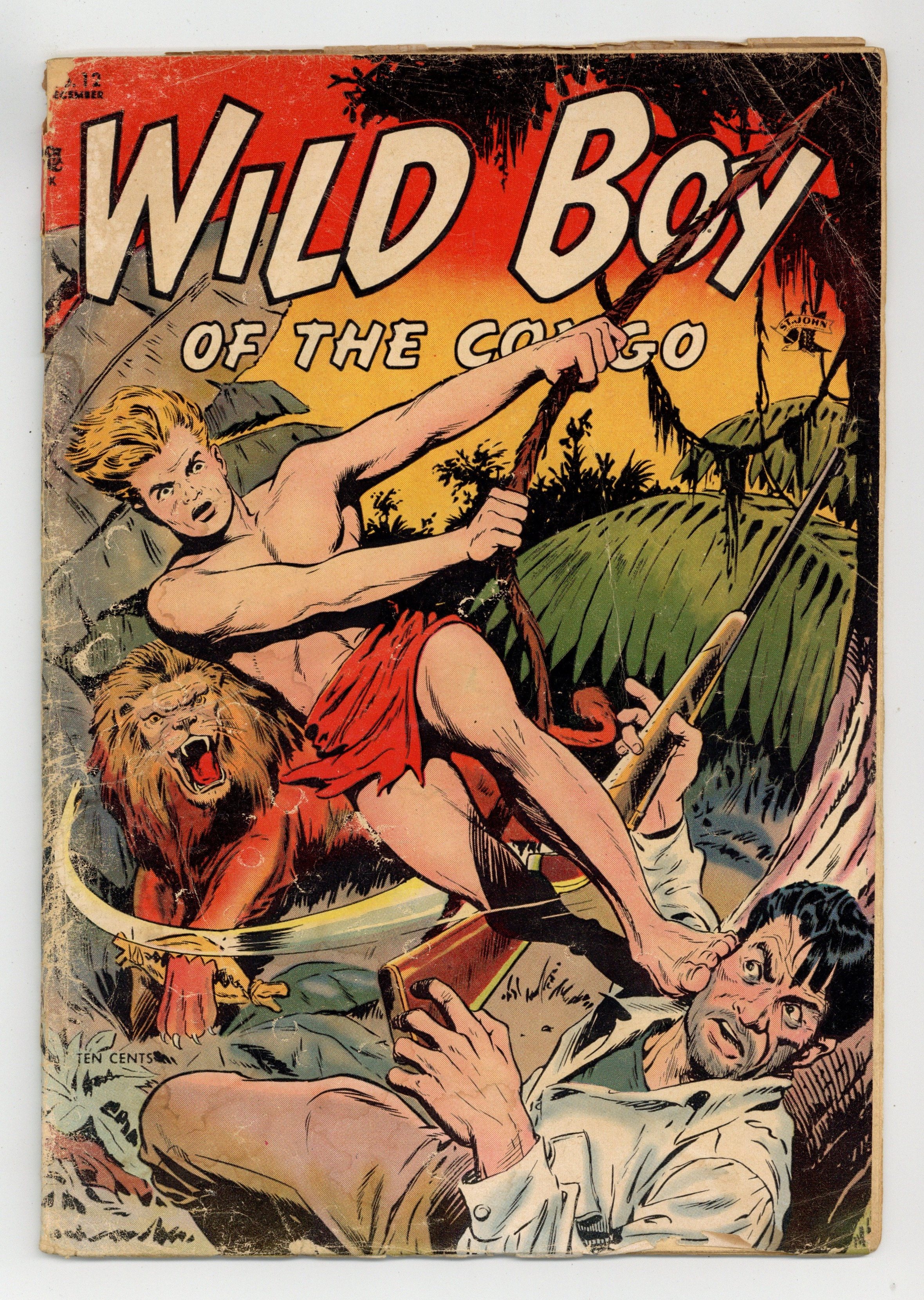 Cover by Matt Baker. "The Curse of Kalunga!"; The coward Wagabi changes into a reptile. "Man-Eater"; Rex Cutler is taking pictures of wild animals until Watibbi force him to leave the territory. "The Bird-Man Legend" text story. "The River of Allah," pencils by Irv Novick; Joe is hired by a fanatical man to guide him on a holy mission to find the river of Allah. Boy Marvel of the West ad for Kid Cowboy Comics. "Giants of the Jungle"; Wild Boy must win a contest of running, jumping and throwing to free his friend Keeto from the Wattusi tribe. Published by St. John. 36 pgs., full color. $0.10. Cover price $0.10.