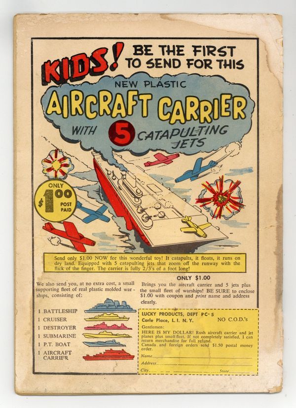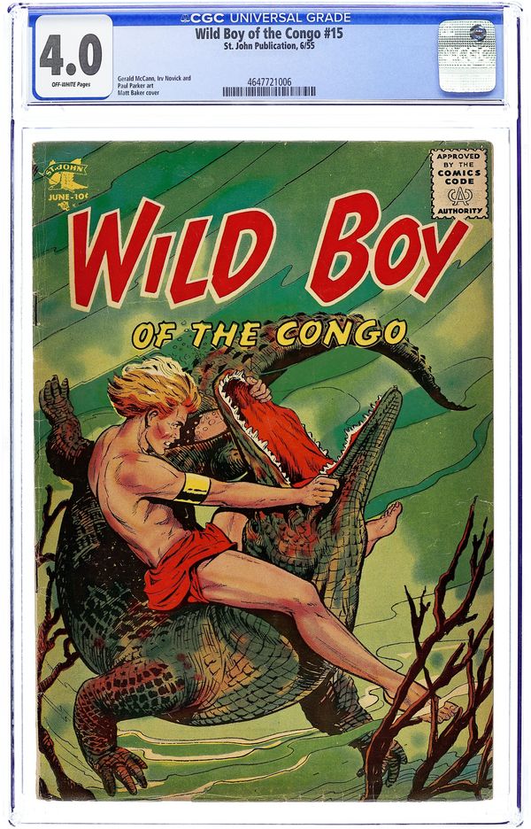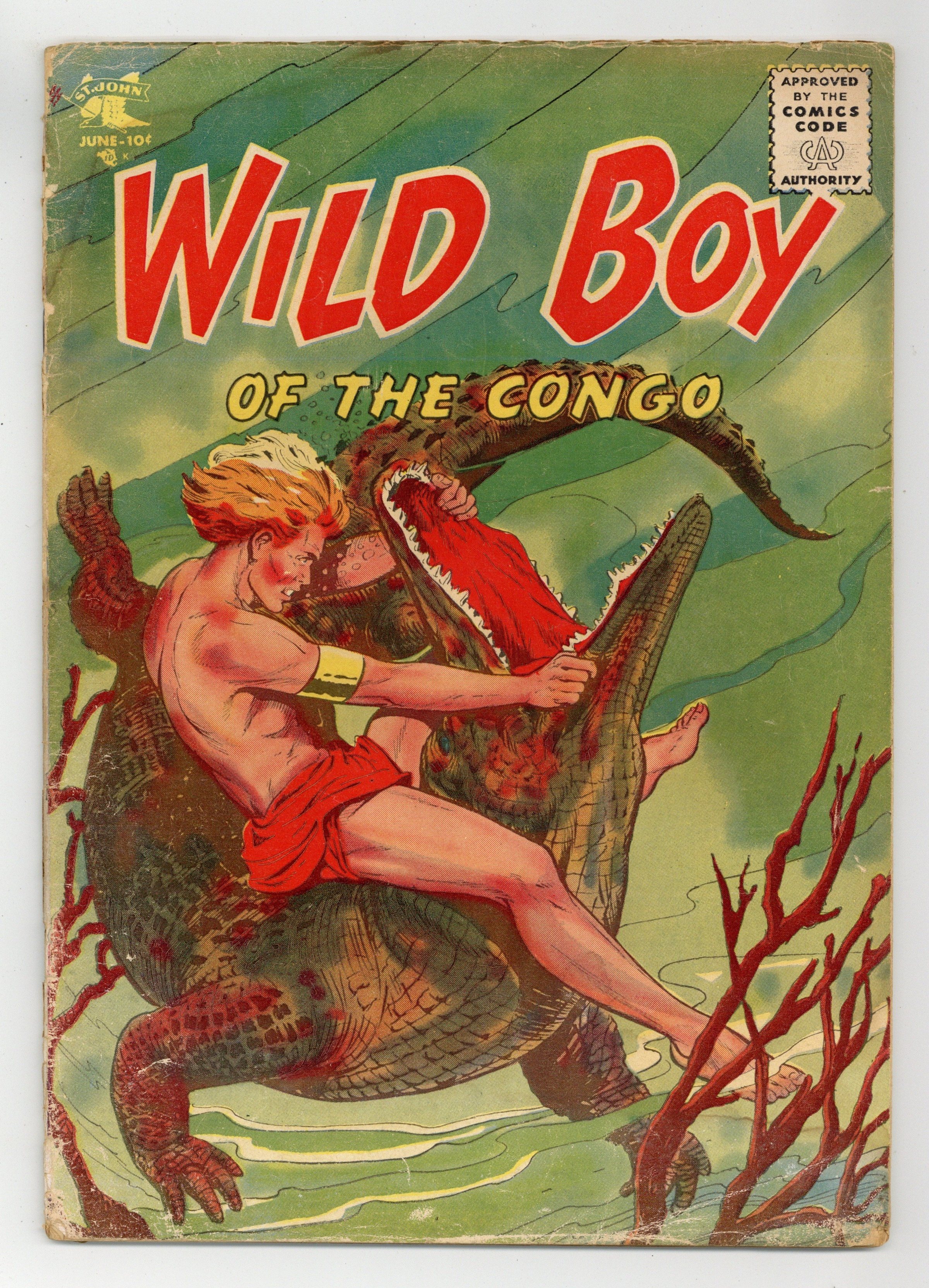 Cover by Matt Baker. "The White Robe of Courage," art by Gerald McCann; The chief's White Robe of Courage has been handed down from father to son, but chief Jaru's son show no courage to wear it. "The Winged Gods of Walla-Habi," art by Irv Novick; Joe Barton and Sumi find uranium at the summit of Walla-Habi vulcano. "The Most Dangerous Cow" text story. "The Slavers," art by Paul Parker; Wild Boy and Keeto are captured by slave traders. "Big-Time Hunter," pencils by Irv Novick, inks by Bernard Sachs; Joe takes the Hodges family on a safari that spells trouble with a big-shot father. Jungle Oddities non-fiction story, art by Ross Andru. Published by St. John. 36 pgs., full color. $0.10. Cover price $0.10.