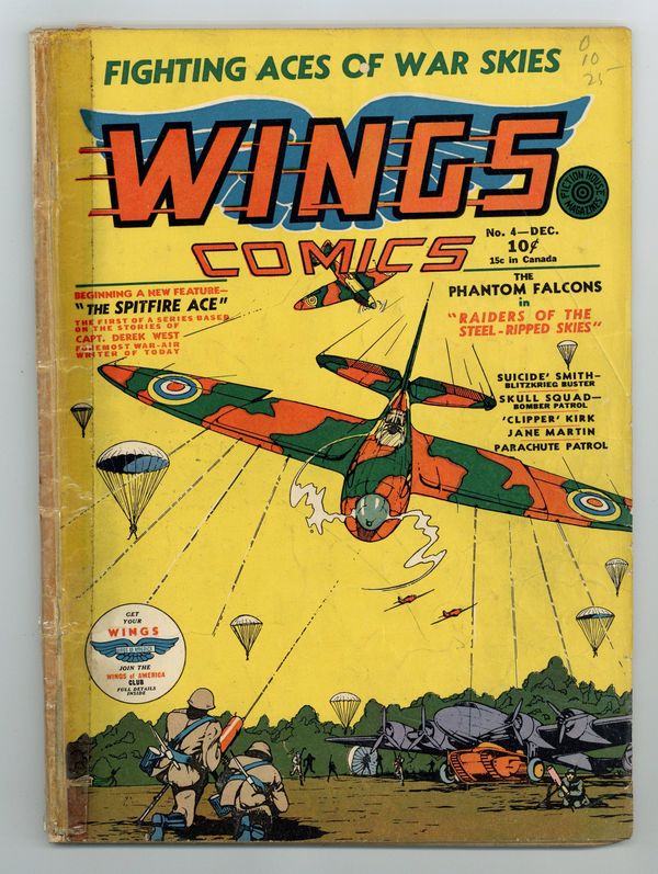 Cover by Gene Fawcette. Edited by Malcolm Reiss, Jerry Iger and Will Eisner. Stories and art by Arthur Peddy, Witmer Williams, Henry Kiefer, Klaus Nordling, Gene Fawcette, George Tuska, Leonard Frank, and Alex Blum. Aviation-themed adventure, combat and history tales from pioneering comics publisher Fiction House. A Brit, a Scot and an American fly for the RAF as the Skull Squad; Agent F4 discovers that the commander of an air squadron is a Nazi spy; A story speculating on the future use of planes to airlift tanks! Skull Squad; Parachute Patrol; Jane Martin; Clipper Kirk; F4 of the Air Intelligence; Suicide Smith; The Phantom Falcons; Wing Tips; Dodo Squadron; Tanks By Plane; Powder Burns; Spitfire Ace; Greasemonkey Griffin. 68 pages, Full Color. Cover price $0.10.