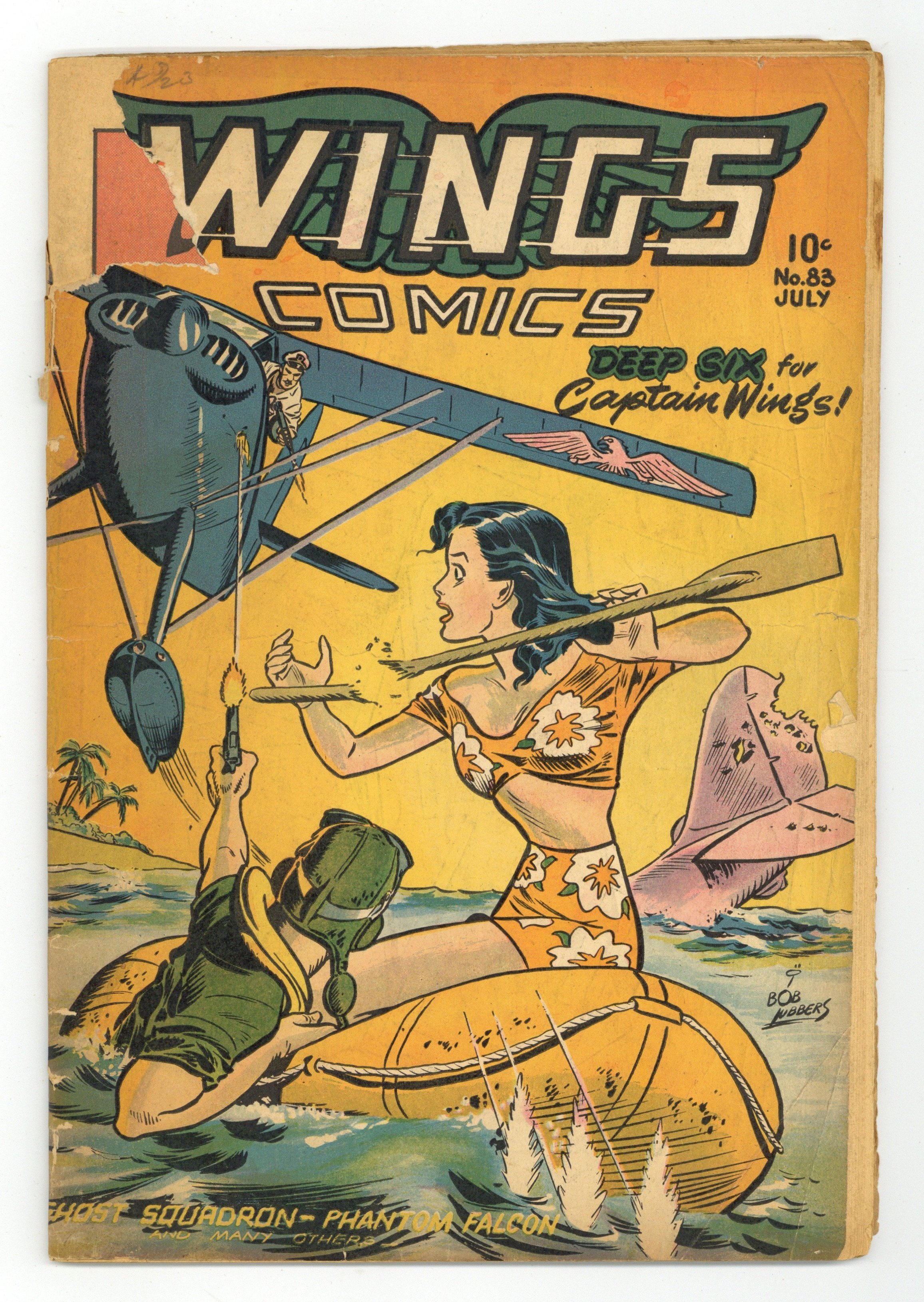 Cover by Bob Lubbers. Edited by J.F. Byrne. Stories and art by Bob Lubbers, Fran Hopper, Al Walker, George Evans, Howard Larsen, John Celardo and Maurice Whitman. Aviation-themed adventure, combat and history tales from pioneering comics publisher Fiction House. Resort owners form a sinister cartel when Jane Martin promotes new airborne travel-trailers; A lightning strike temporarily gives Greasemonkey Griffin super-strength and super-confidence; A Nazi mind-control drug turns soldiers against the US, but the ghosts of its victims seek justice. Captain Wings; Jane Martin; Greasemonkey Griffin; Air Heroes of World War II; Phantom Falcon; Suicide Smith; Ghost Squadron. 52 pages, Full Color. Cover price $0.10.