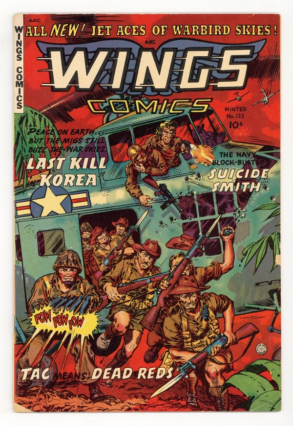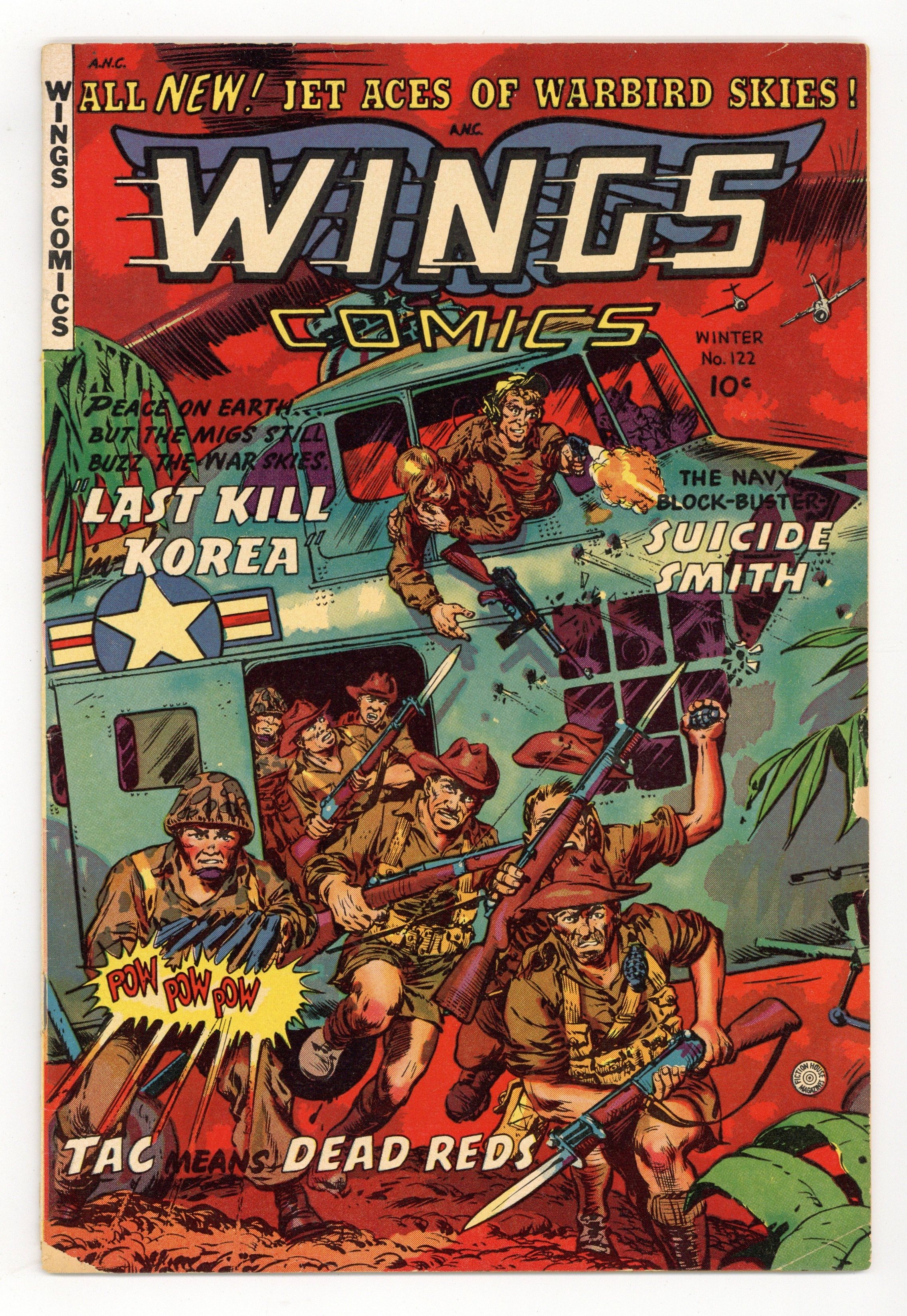 Cover by Maurice Whitman. Edited by J.F. Byrne and Jerry Iger. Stories and art by John Belcastro, A. Albert, Kurt Schaffenberger, Art Peddy, Bernard Sachs and Bill Discount. Aviation-themed adventure, combat and history tales from pioneering comics publisher Fiction House. An American pilot shot down over Korea resurfaces as the voice of communist propaganda broadcasts; A downed airman is sheltered by a beautiful rebel and her forces; Buzz Bennett is trailed back to his carrier by a very determined aircraft. Second Life; Last Kill In Korea; Buzz Bennett; Voice From Valhalla!; Triumph. 32 pages, Full Color. Cover price $0.10.