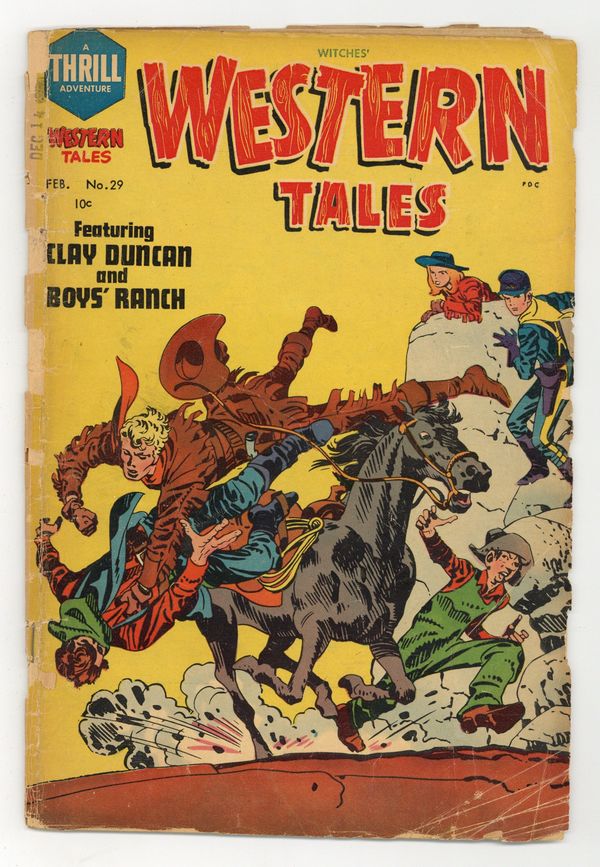 Cover by Jack Kirby and Joe Simon. Stories and art by Mort Meskin, Bruno Premiani, George Roussos, Marvin Stein, Joe Simon and Jack Kirby. As the Comics Code goes into effect and horror comics are taken out of the marketplace, this former horror mainstay switches to reprints of the classic Simon and Kirby comic Boy's Ranch. This kid-gang series set in the Old West is often hailed as a creative high-point in the partnership of Joe Simon and Jack Kirby. Clay and Willie fear the worst after the boys disappear in hostile territory. The townspeople fear Apaches have been attacking their supply wagons, but Clay suspects that it's all a scam by local crooks. Lessons for readers on how to ride, rope and even talk like cowboys. The Last Mail to Red Fork!; How To Ride a Horse, Lesson 5; The Riders of the Pony Express; Bandits, Bullets and Wild Wild Women!; How to Make Your Own Headdress; Ambush at Cherokee Pass; The Man of Iron; How to Spin a Rope, Lesson 5. 36 pages, full color. Cover price $0.10.