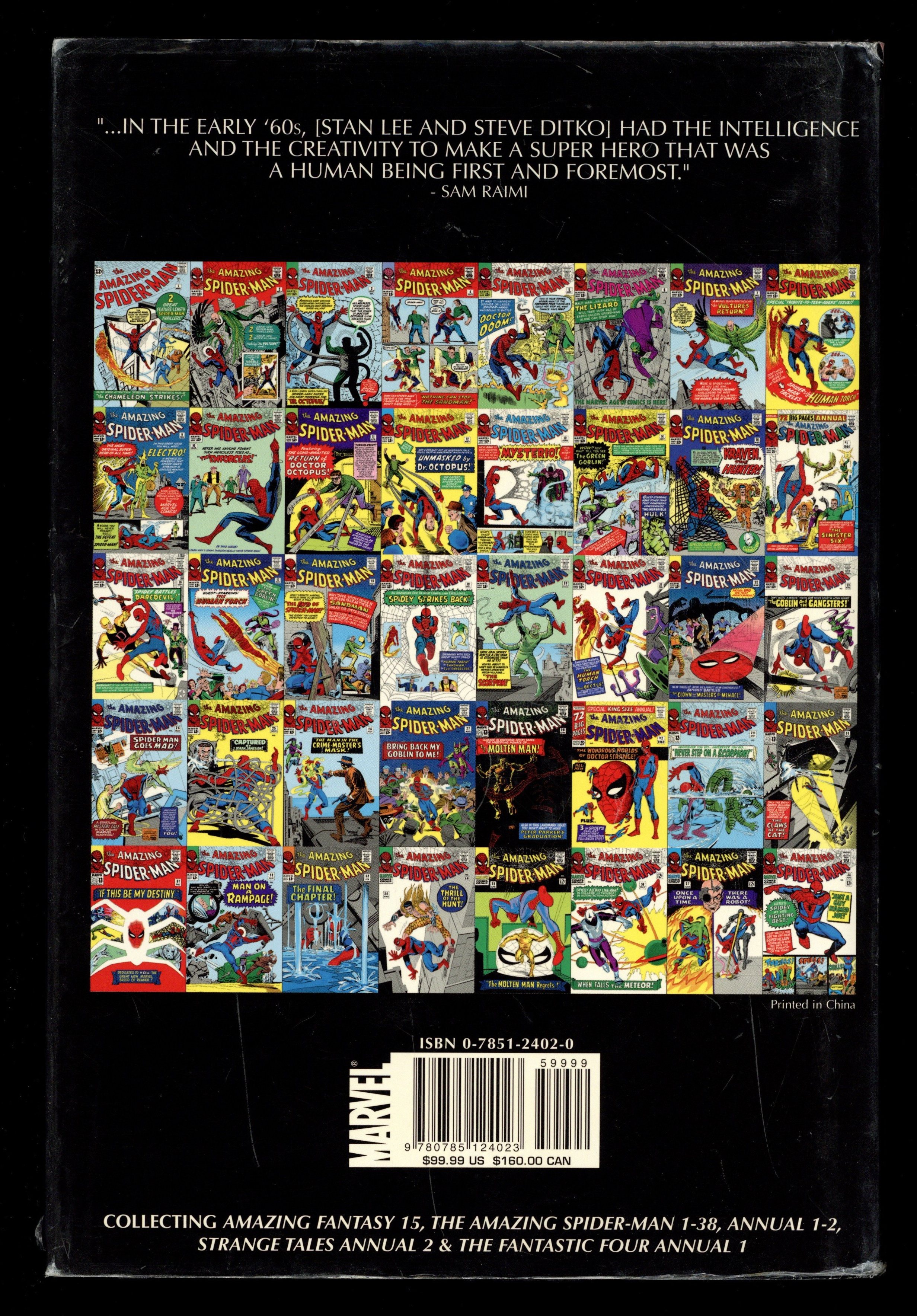 1st Edition - Volume 1 - 1st printing. Collects Amazing Fantasy (1962) #15, Amazing Spider-Man (1963-1998 1st Series) #1-38 and ANNUAL #1-2, Strange Tales (1962) Annual #2, and Fantastic Four (1961-1996 1st Series) Annual #1.