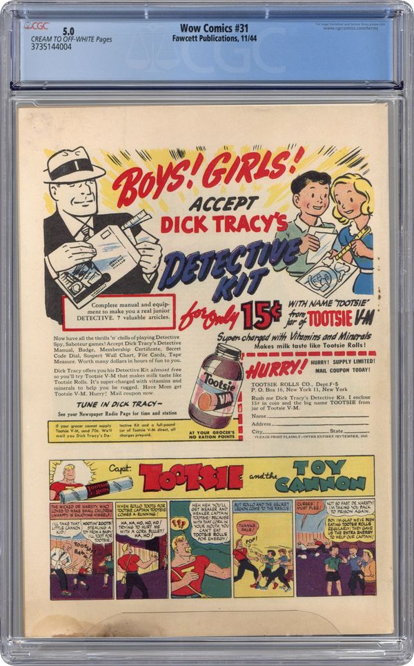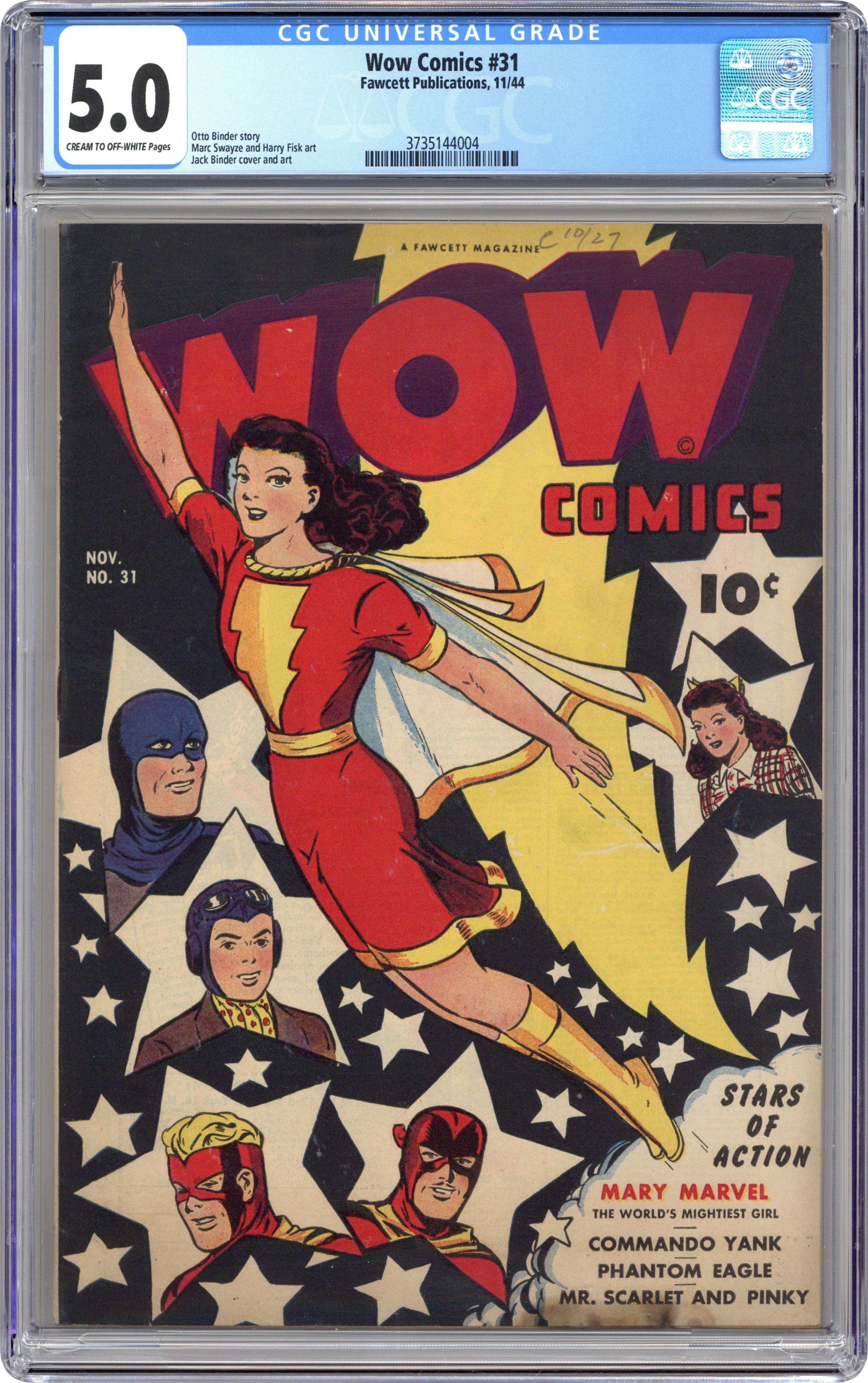 Cover by Jack Binder. Stories and art by Otto Binder, Jack Binder, Marc Swayze, and Harry Fiskshe. A Fawcett anthology with an emphasis on superhero adventure. Mary Marvel is taking a transcontinental flight when a fellow passenger's tall tales start coming true, and affecting the airplane's flight. Phantom Eagle follows the trail of the mystical Black Mace to the lost Arabian kingdom of Princess Mojud. Mr. Scarlet and Pinky face the sinister Dr. Promise, whose promise is that he will kill them within eleven hours. Plus a PSA for wartime paper drives featuring Mary Marvel. Mary Marvel; Commando Yank; Phantom Eagle: In the Hills of Araby; Penny Graves: The Mysterious Gunshot; Mr. Scarlet and Pinky. 32 pages, Full Color. Cover price $0.10.