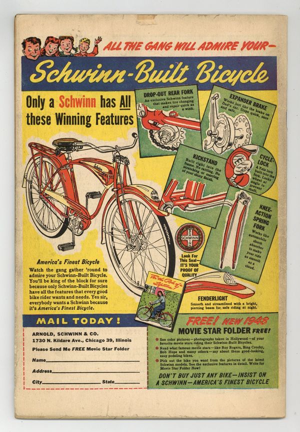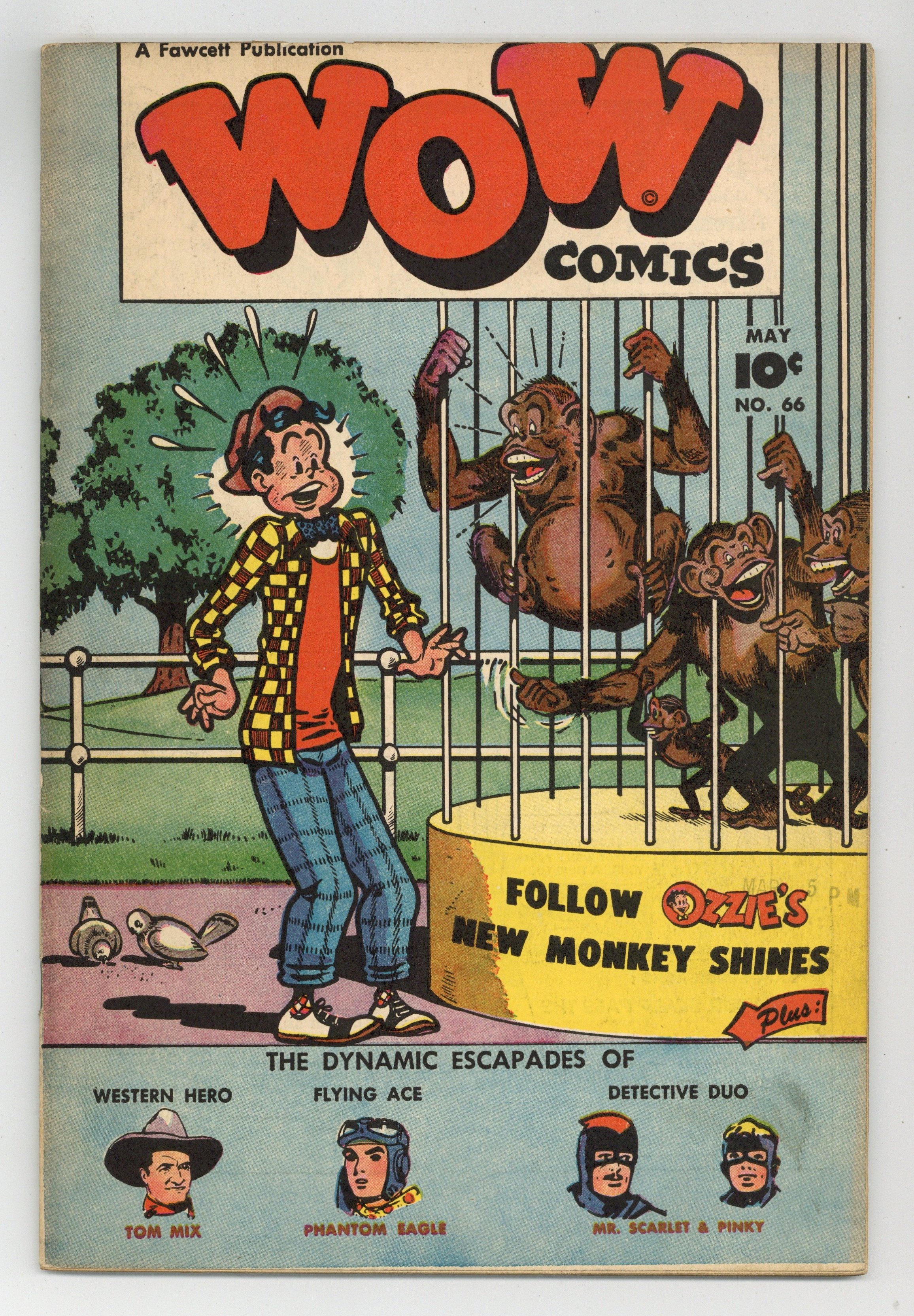$60.00Stories and art by Carl Pfeufer, Bill Woolfolk and Marc Swayze. A Fawcett anthology with an emphasis on superhero adventure. Ozzie accidentally destroys Philomel Carter's toothpick model of the Eiffel Tower, and tries to build a toothpick Statue of Liberty to make up for it. Mr. Scarlet and Pinky realize that the figures in a wax museum are, shockingly, dead bodies covered in wax. When an experimental rocket launches with Foggy and Jerry on board, Phantom Eagle takes off in pursuit. Ozzie: Hobby Happy; Willie the Worm; Droopy the Ant Bear and Reddy Fox; Sloppy the Pig; Mr. Scarlet and Pinky: The Vanishing Corpse; Muscle Hedd; Phantom Eagle and the Runaway Rocket; Sherlock the Monk; Penny Graves: Hot-Seat Evidence; Richard Richard, Private Dick: The Case of Broken Eggs; Fuzzy Bear; Tom Mix: Tony's Feud. 48 pages, Full Color. Cover price $0.10.