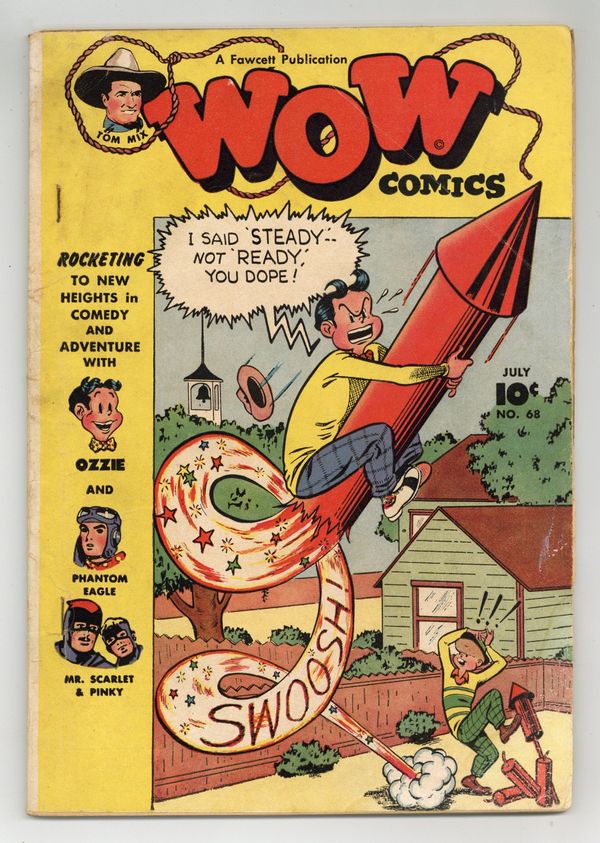 Cover by Warren Kremer. Stories and art by Dick McCay and Marc Swayze. A Fawcett anthology with an emphasis on superhero adventure. Ozzie gets so good at riding a bicycle on a high wire, he gets a job at the circus. Mr. Scarlet and Pinky track the Gargoyle, a jewel thief who is a master of disguise. The Demon Bandit may be tricky, but he didn't count on the bad driving of Richard Richard, Private Dick. Plus a profusion of vintage comics-format ads, including a hair-cream ad featuring detective Sam Spade, and a Tootsie Roll ad, Captain Tootsie Tames A Tornado, with art by Shazam co-creator CC Beck. And "Comix Cards" (like the later Marvel Value Stamps) featuring Nyoka the Jungle Girl. Ozzie: Circus Daze; Bobo; Mr. Scarlet and Pinky: The Gargoyle; Muscle Hedd; Phantom Eagle; Penny Graves: The Bronze Raven; Richard Richard, Private Dick: The Case of the Used Car; Tom Mix: Challenge To Death. 48 pages, Full Color. Cover price $0.10.