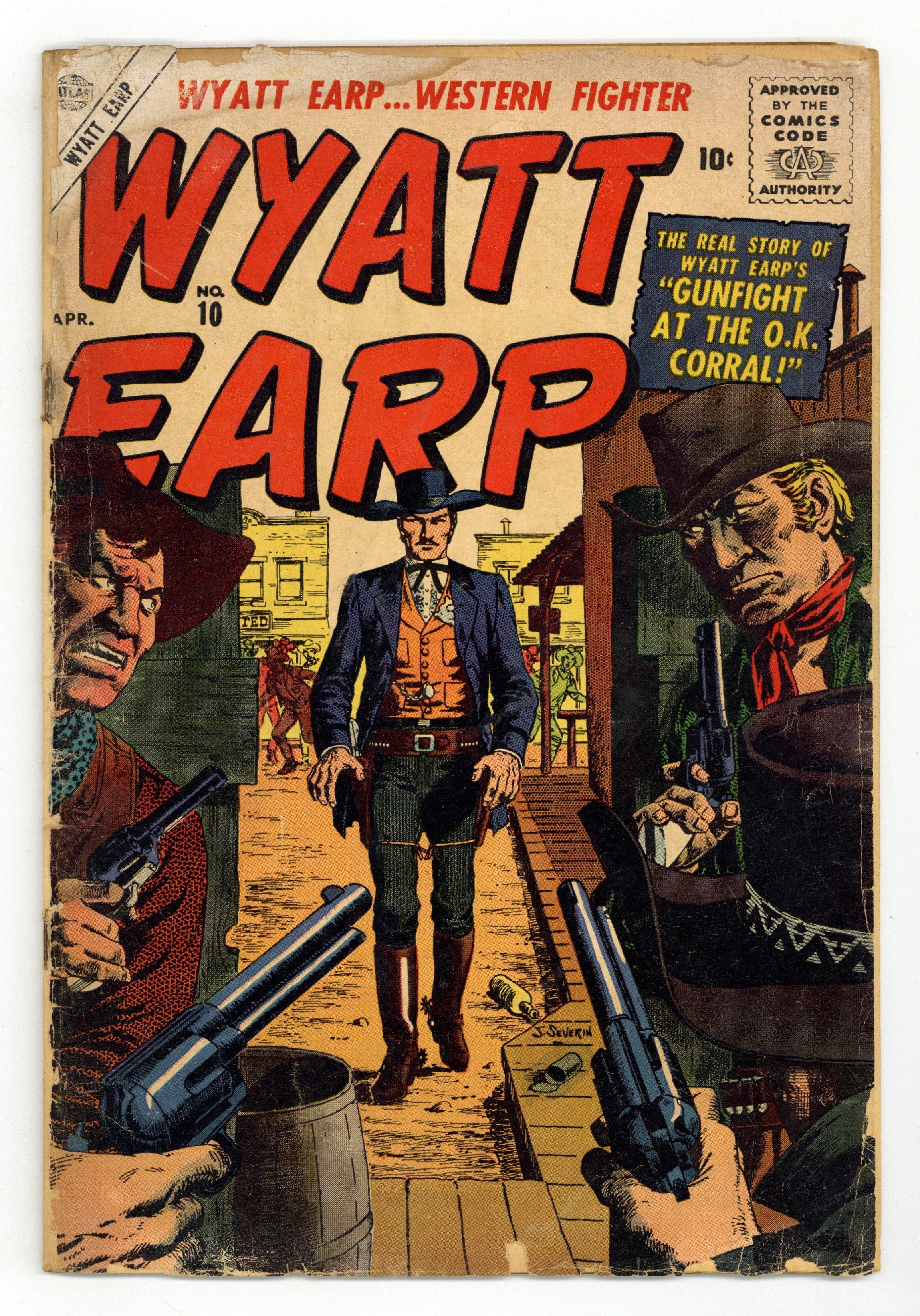 Starts Jan 3 Cover art by John Severin. The O.K. Corral Gunfight starring Wyatt Earp and Doc Holliday, art by Dick Ayers. Wild Horses text story. Gunslinger starring Wyatt Earp, art by John Severin. Cactus Corners starring Wyatt Earp, art by Dick Ayers. The Gun, script by Stan Lee, art by Werner Roth; story is told from the perspective of the gun. Comanches On the Warpath starring Wyatt Earp, art by John Severin. 36 pgs. $0.10. Cover price $0.10.