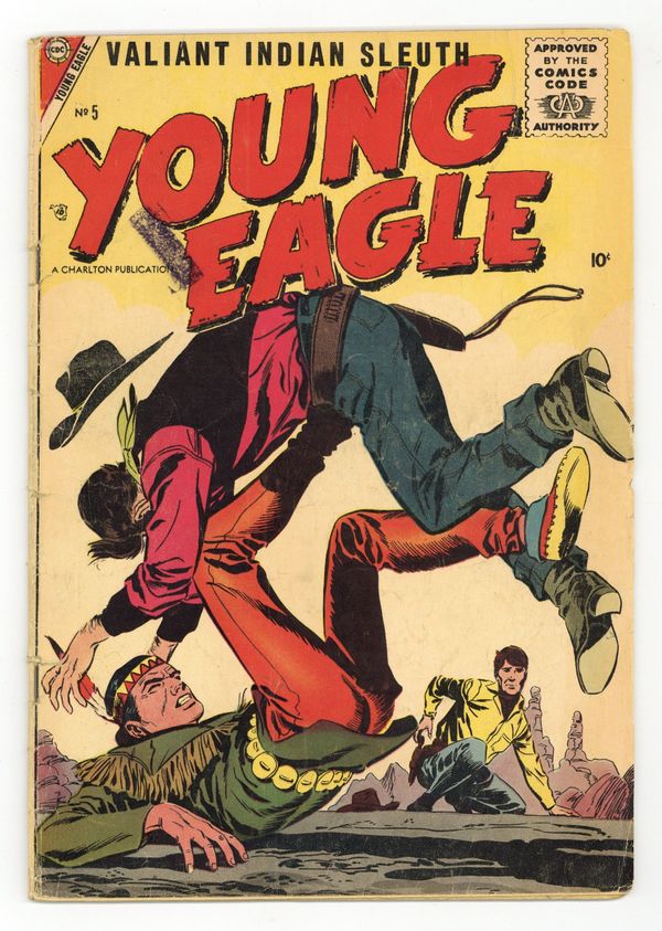 Cover by Dick Giordano and Vince Alascia. Stories and art by Charles Nicholas, Sal Trapani, Bill Discount and Rocco "Rocke" Mastroserio. Frontier scout Young Eagle and his trained eagle Clawfoot aid the US Cavalry at Fort Wayne. When fellow tribesmen are legally swindled out of their gold-rich land, Young Eagle tries to stop the scam. After saving each other's lives, Young Eagle and outlaw Jim Slavin join forces to battle a land baron who wants Slavin's water. When trapper Kurt Dolman repeatedly violates the treaty with Young Eagle's tribe, he risks starting a war. Indian Gold; Loonie Les; White Brother; The Net of Nature; Molasses Mouth; Treaty Trouble; Potlatch. Final issue of the series. 32 pages, Full Color. Cover price $0.10.