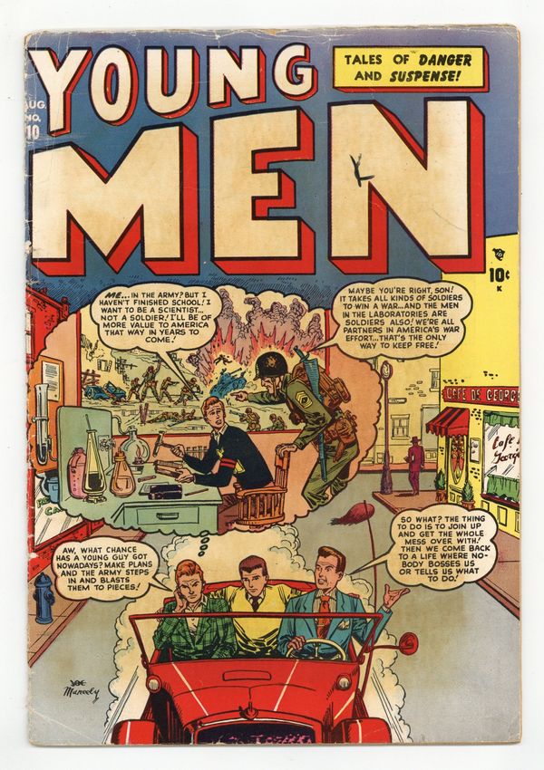 Cover by Joe Maneely. Written by Hank Chapman and unknown. Art by Bill Savage, Vernon Henkel, Pete Morisi, Gene Colan and Tony DiPreta. Tales of danger and suspense! In this issue: "One Must Die" by Hank Chapman and Bill Savage; Rocky Jorden in "The Murder Cargo Caper!" with art by Vernon Henkel; "Suicide Mission" with art by Pete Morisi; "Shanghied!" text story with illustration by Gene Colan; and "The Faster the Better" with art by Tony DiPreta. 36 pages, full color. Cover price $0.10.