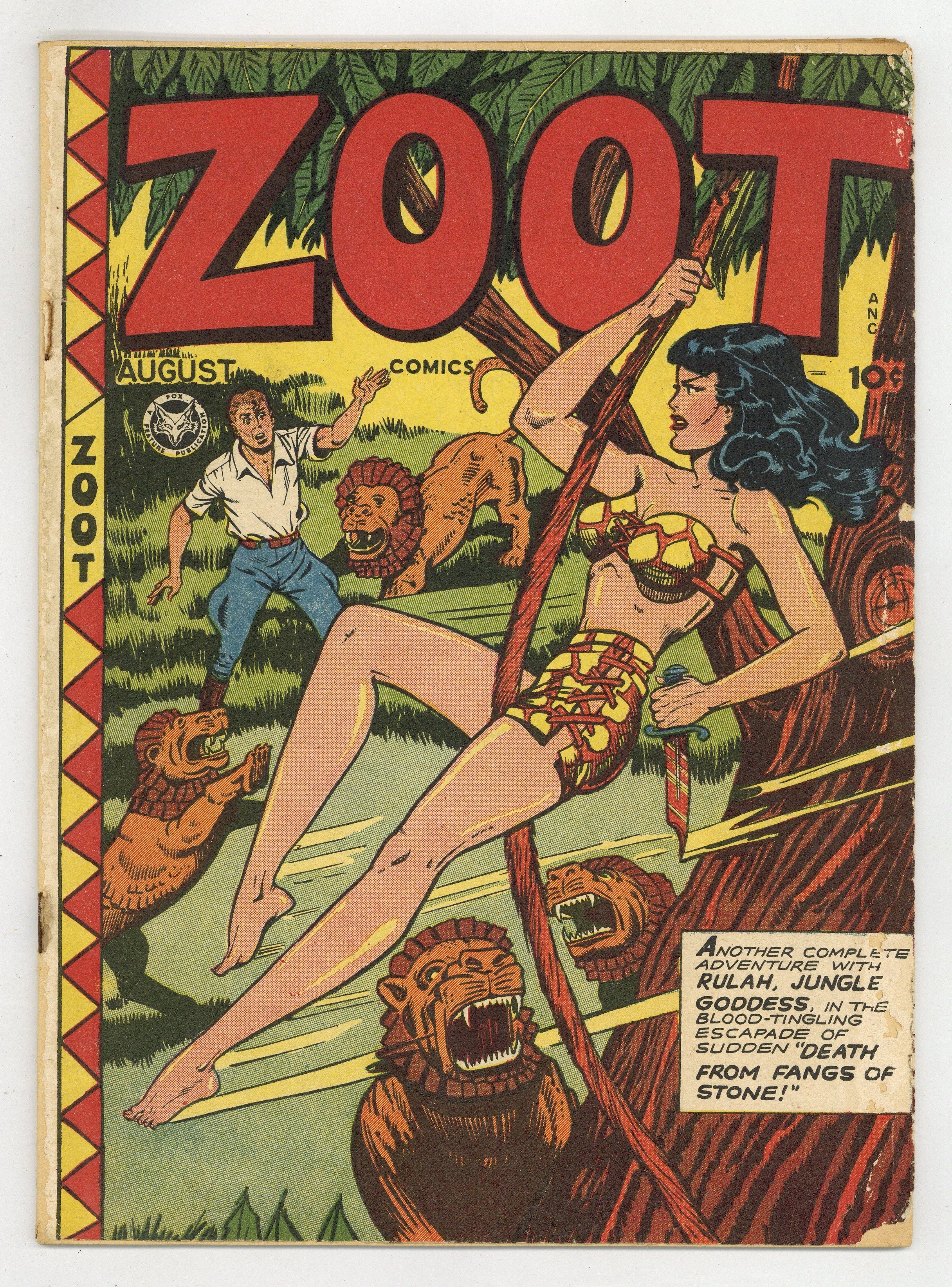 Art by Matt Baker, Stan Ford and Jo Logan. Cover by Matt Baker. Tales of adventure featuring Rulah, Jungle Goddess, and art by legendary good-girl artist Matt Baker. Rulah warns a treasure-hunter about a dangerous witch doctor, but he refuses to believe a woman knows more about the jungle than he does; Fun facts about elephants; Spacefaring hero Rick Evans battles aliens that are using an iceberg as a base for invasion. Death from Fangs of Stone!; African Adventure; Natural Science: Elephants; Rick Evans: The Green Menace from Voluta; One Round Hogan. 36 pages, Full Color. Cover price $0.10.