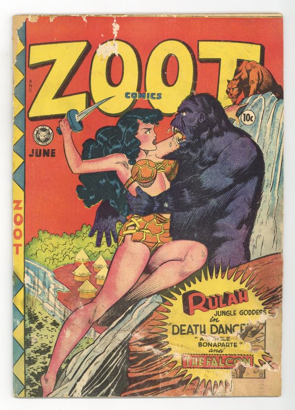 Art by Matt Baker and others. Tales of adventure featuring Rulah, Jungle Goddess, and art by legendary good-girl artist Matt Baker. A Broadway dancer brings her troupe to the jungle tribe that taught her wicked dances, but doesn't mention that they're cannibals; Rulah is challenged by a lost French colony and its self-appointed Napoleon; Rulah faces a blonde villainess in a feather bikini and her army of trained falcons. More pre-Code jungle action, gorgeous good-girl art and just plain strange storytelling. Another great jungle goddess-vs.-gorilla cover. Death Dancers; A Jungle Bonaparte; Jungle Pitfall; The Falcon. 36 pages, Full Color. Cover price $0.10.
