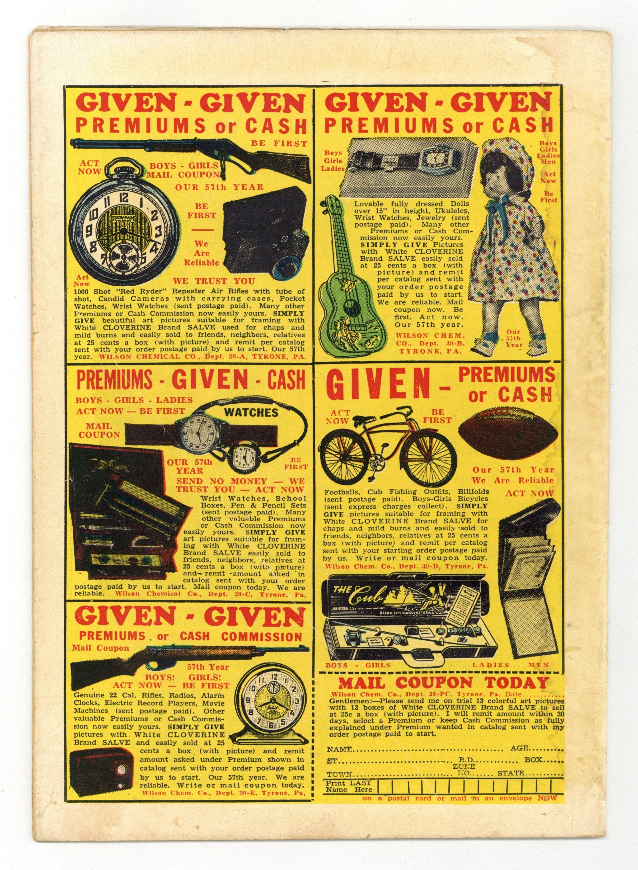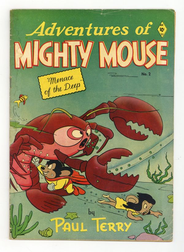 The world's mightiest mouse combines funny-animal antics with superhero adventure as he fights for mice everywhere. Numbering continues from Mighty Mouse Adventures (1951 St. John) #1. In an issue-length adventure, Mighty Mouse dives into the ocean when mouse sailors start disappearing. He discovers an evil cat submersible and an underwater hideout of cats built by enslaved mouse sailors. He must stop them before they succeed in their plan to blow up Terrytown from below. Percy the cat thinks he's one-up on Little Roquefort when he sees the mouse going into the joke shop. Heckle and Jeckle: Lost in a Cave; Menace of the Deep; Terry Bears; Farmer Gray; Gandy Goose; Little Roquefort. 32 pages, Full Color. Cover price $0.10.