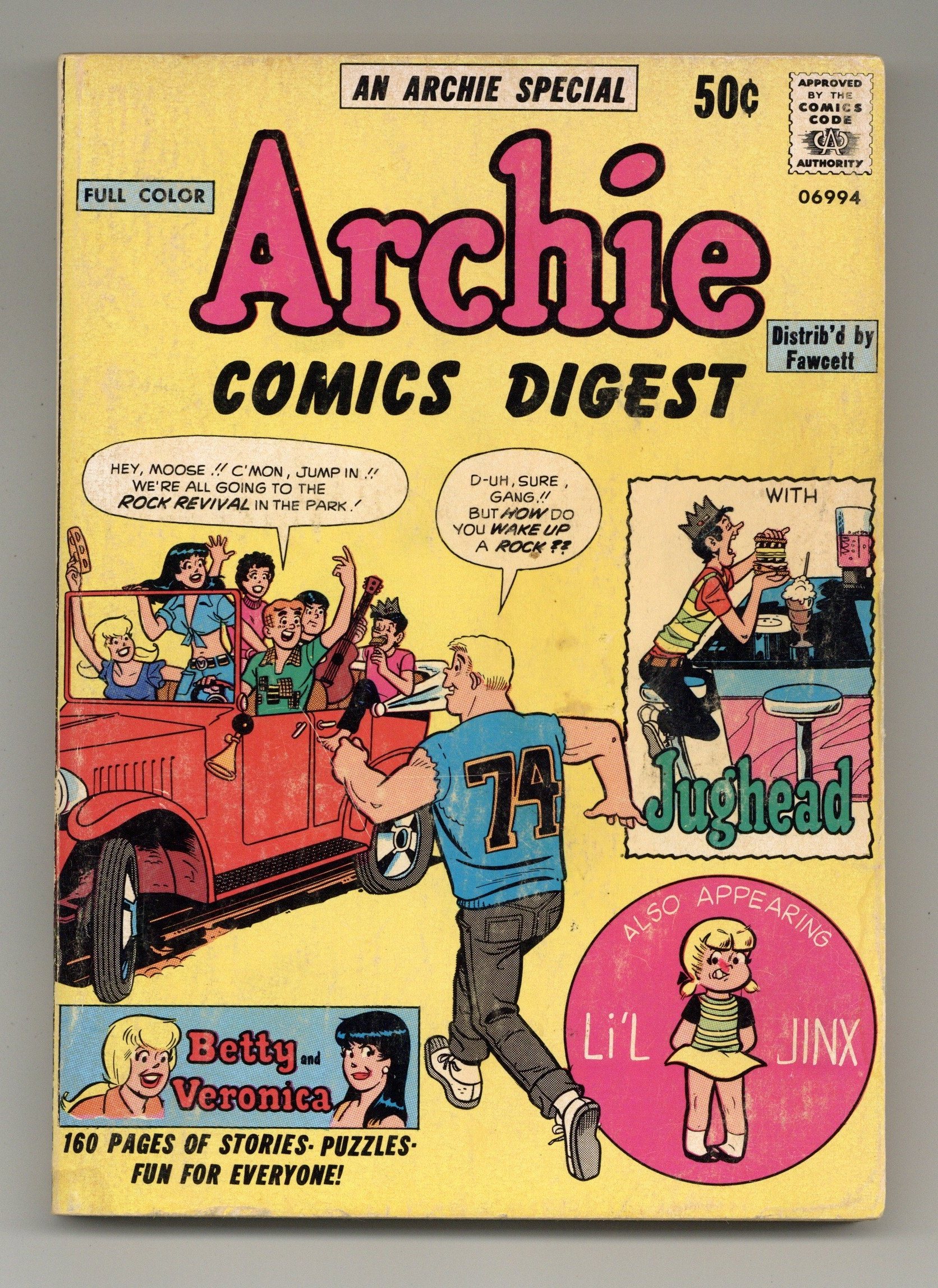 Cover pencils by Dan DeCarlo. "The Clock," pencils by Harry Lucey; Reggie lent Archie an old alarm for a science experiment, but Archie objects to what Reggie wants in return. "Stop, Book and Listen!" one-page Li'l Jinx story by Joe Edward. "Cave Man Casanova," script by Frank Doyle, art by Harry Lucey; Archie dreams he's a caveman, but doesn't understand why the guys with funny shapes (Betty and Veronica) want him to catch them. "Sign In Please!", script and art by Joe Edwards; Li'l Jinx's dad lost his voice and has to write messages. "Who Me?", pencils by Harry Lucey; Mr. Lodge asks Veronica what she sees in Archie and she can't think of anything to say. "Practice Makes Perfect," script by Dick Malmgren, pencils by Dan DeCarlo, inks by Rudy Lapick; Mr. Lodge wants Veronica to learn to play an instrument. "Trouble Spot," pencils by Harry Lucey; Resenting the teachers' belief that accidents naturally happen when he's around, Archie tries to prove that trouble can happen when he's not around. "Swamp Buggy," script by Frank Doyle, pencils by Dan DeCarlo, inks by Rudy Lapick; To bust up Betty's date with Archie, Veronica handcuffs herself to Archie's wrist. "Small Success," script by Frank Doyle, pencils by Dan DeCarlo, inks by Rudy Lapick; In order to tease Archie, Betty and Veronica claim Dilton is a chick-magnet. 164 pgs., full color. Cover price $0.50.