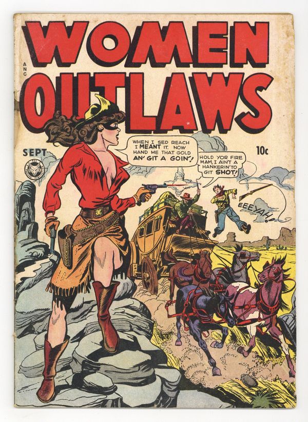 In order of appearance: "Hattie Long, Beautiful Blonde Bandit, The Cursed Cayuse"; "Belle Starr, She Sold Her Soul to Satan"; "Killer at Large" reprinted in Startling Terror Tales (1953-54 2nd Series) #6 and Shock Detective Cases (1952) #20; "Shanghai Mary, Wild Gal of the West, The Sailor's Haven"; "Little Rick, Wild Gal of the West"; "Poker Annie, A Wild Gal of the West"; and "Trigger Tess, A Wild Gal of the West.". "A Slug for the Sheriff" text story. 36 pages. Full color. Cover price $0.10.