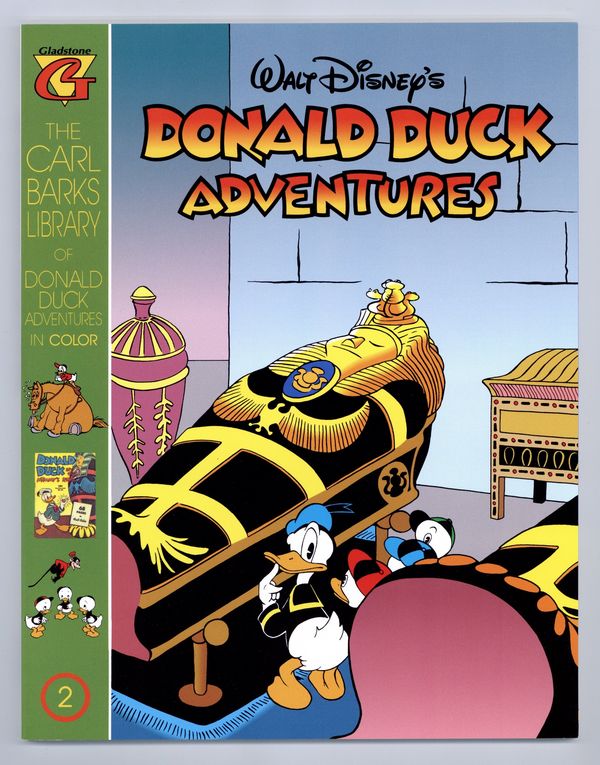 Cover art by Carl Barks. "Donald Duck and the Mummy's Ring," script and art by Carl Barks; Donald, Dewey, and Louie pursue a kidnapped Huey and a stolen mummy to Egypt; from Four Color (Dell, 1942 series) #29. "The Hard Loser," script and art by Carl Barks; Donald and the nephews enter a screwball horse race. "Too Many Pets," script and art by Carl Barks; The nephews adopt an organ grinder's monkey and thwart a spy. Ringing In Some Changes article by Geoffrey Blum; Details the differences in three pages between the original publication of "Mummy's Ring" and Uncle Scrooge and Donald Duck (1965); Barks copied the pages in 1965 and there are minor differences; The three redone pages are reproduced in black and white in one-fourth page size. Originally distributed sealed with trading card insert. Trading card may or may not be present. Softcover, 8 1/2-in. x 11-in., 56 pages, full color. Cover price $7.95.