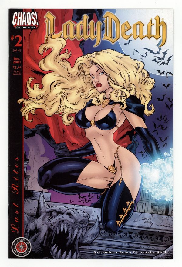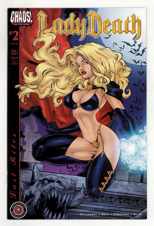 $15.00by Ostrander, Reis, & Pimentel; cover by Mota & Salles Behold the second chapter in the series that sets the stage for Lady Death's ultimate dilemma: will she return to the cold, remote goddess she once was, or will she remain alive? In this pulse-pounding issue, Lady Death has sworn to free Innsmouth's soul spheres but the secrets are guarded by a creature named Grimoire and he isn't willing to share. When Lady Death tries to force him, she winds up battling for her life. Meanwhile, Vile takes another step closer to finding Sarah. Also introducing ?? Sanctity! She seeks to save the innocence of children ?? by killing them! FC, 32pg (2 of 4)$2.99 Cover price $2.99.