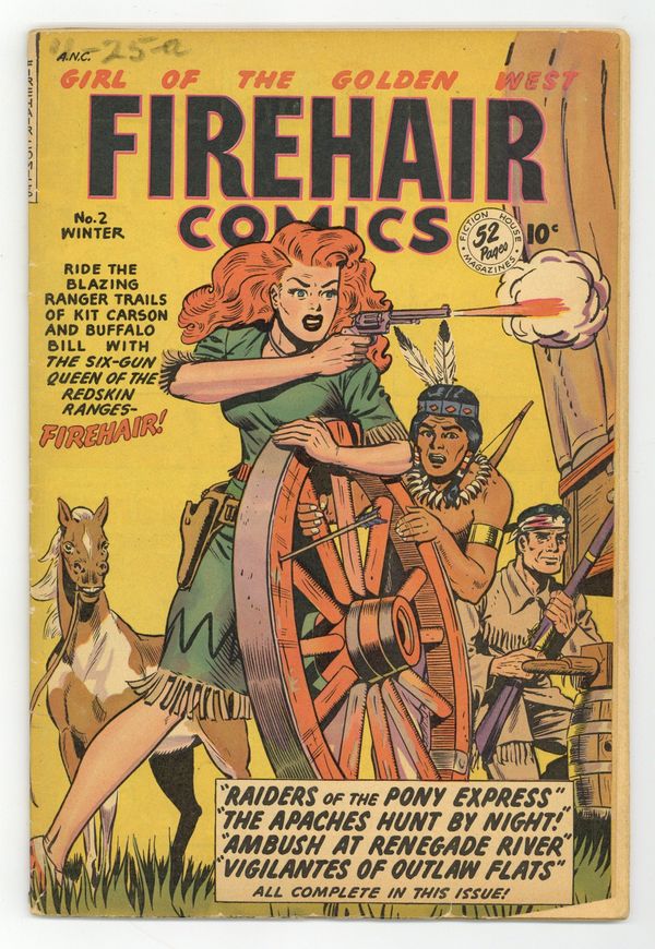 Published Dec 1949 by Fiction House.$135.00Art by Lee Elias. Cover by Jack Kamen. Adventures of the Western hero, a white woman raised by the Dakota tribe. This issue continues reprinting her origins from Rangers Comics (1941): memory restored, she claims her inheritance, then returns to the tribe and her heroic career as Firehair. Firehair races to save her adopted brother Little Ax from being hanged by whites; Snake-oil salesmen learn of the hidden Dakota fortune and set out to steal it. Raiders of the Pony Express; The Picture of Innocence; The Apaches Hunt By Night; Ambush At Renegade River; Vigilantes of Outlaw Flats. Title changes to Pioneer West Romances (1950) for issues 3-6, but is otherwise the same comic, including the Firehair logo on the cover. 52 pages, Full Color. Cover price $0.10.
