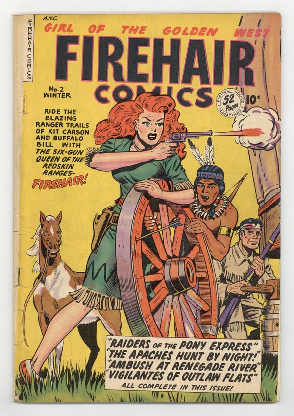 Art by Lee Elias. Cover by Jack Kamen. Adventures of the Western hero, a white woman raised by the Dakota tribe. This issue continues reprinting her origins from Rangers Comics (1941): memory restored, she claims her inheritance, then returns to the tribe and her heroic career as Firehair. Firehair races to save her adopted brother Little Ax from being hanged by whites; Snake-oil salesmen learn of the hidden Dakota fortune and set out to steal it. Raiders of the Pony Express; The Picture of Innocence; The Apaches Hunt By Night; Ambush At Renegade River; Vigilantes of Outlaw Flats. Title changes to Pioneer West Romances (1950) for issues 3-6, but is otherwise the same comic, including the Firehair logo on the cover. 52 pages, Full Color. Cover price $0.10.