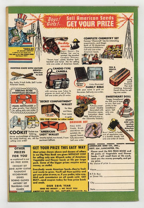 Cover by Nina Albright. Stories and art by Ray Gill, Nina Albright, Jim Wilcox, Mary Leland and B. Gordon Guth. Sometimes listed as 4Most #18. Four different stories featuring clean-cut teen heroes of the 1940s from Novelty Press. Laura Bradly, daughter of Coach Bradly, is abducted by a crook who looks just like Dick Cole. The Cadet's pal Dan meets his match in action girl Hilda Potts, in a story (and cover) by early female comics artist Nina Albright. Jerry's attempts at automating their chores with inventions aren't nearly as successful as Edison's, but he does invent the riding lawnmower - sort of. Edison Bell tells young readers how to build a tepee. Also featuring vintage comics ads starring "Pepsi" the Pepsi-Cola Cop, Volto from Mars and History's Mysteries. Classic good-girl swimsuit cover by Nina Albright. Dick Cole; Edison Bell; How to Make an American Teepee; The Prayer; Oh, Doctor!; The Call; The Cadet; Candid Charlie. 48 pages, Full Color. Cover price $0.10.