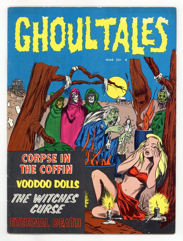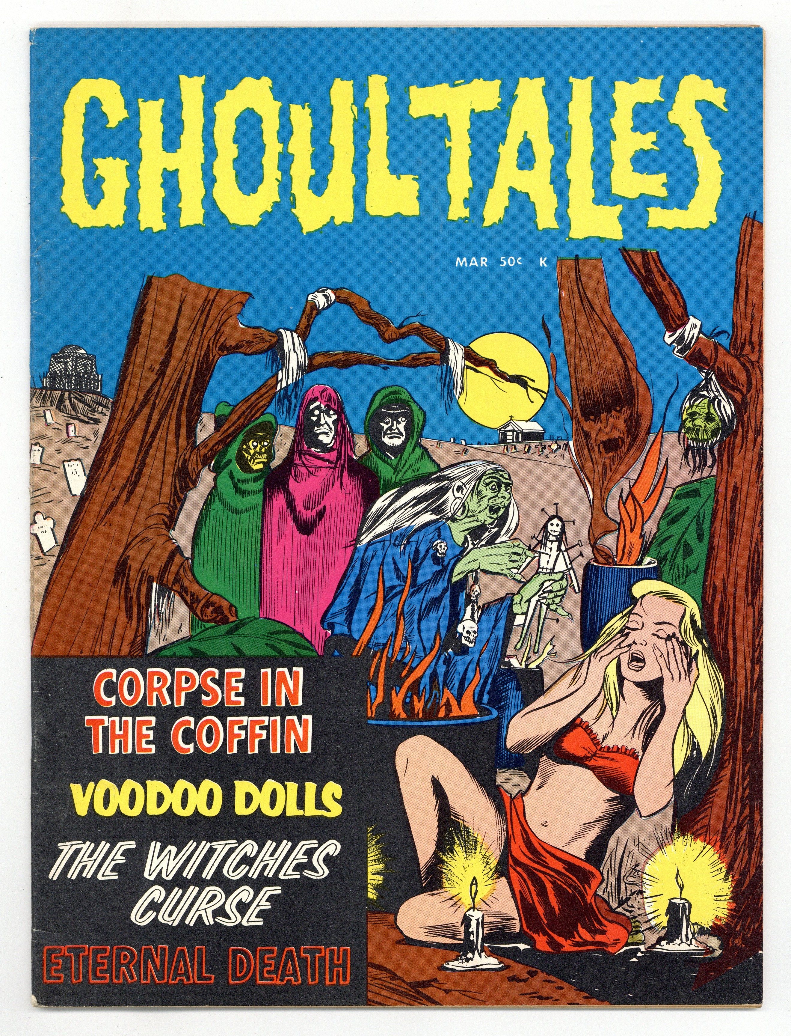 Published Mar 1971 by Stanley Publications.$20.50Stories and art by Eugene Hughes and Sal Trapani. A magazine anthology featuring tales of horror from Stanley Morse Publications. A woman seeks revenge after her husband kills her father with voodoo. Honeymooners passing through Salem, Massachusetts are stalked by the creatures summoned by a witch's ghost. Ghosts rise to reveal their living secrets in epitaphs, giving Edgar an unpleasant surprise about his late wife. Corpse In the Coffin; Rattrap; Eternal Death; Low Life; Voodoo Dolls; Witches Curse; Epitaph; Curse of the Zamboori. 8 1/2-in. x 11-in., 48 pages, B&W. Cover price $0.50.