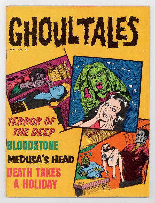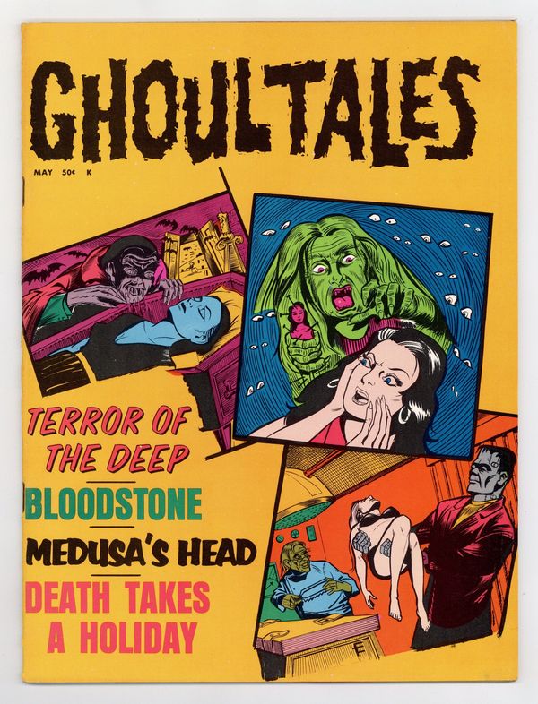A magazine anthology featuring tales of horror from Stanley Morse Publications. The truth is revealed about why a certain gem is called a "bloodstone." A former employee takes holiday-themed revenge on the businessmen who framed him. A man who loves to eat finally pushes his wife too far. Dream!; Medusa's Head; The Bloodstone!; Death Takes a Holiday!; The Other World; Cremation; The Way to a Man's Heart; The Gossips!; Terror of the Deep. 8 1/2-in. x 11-in., 48 pages, B&W. Cover price $0.50.