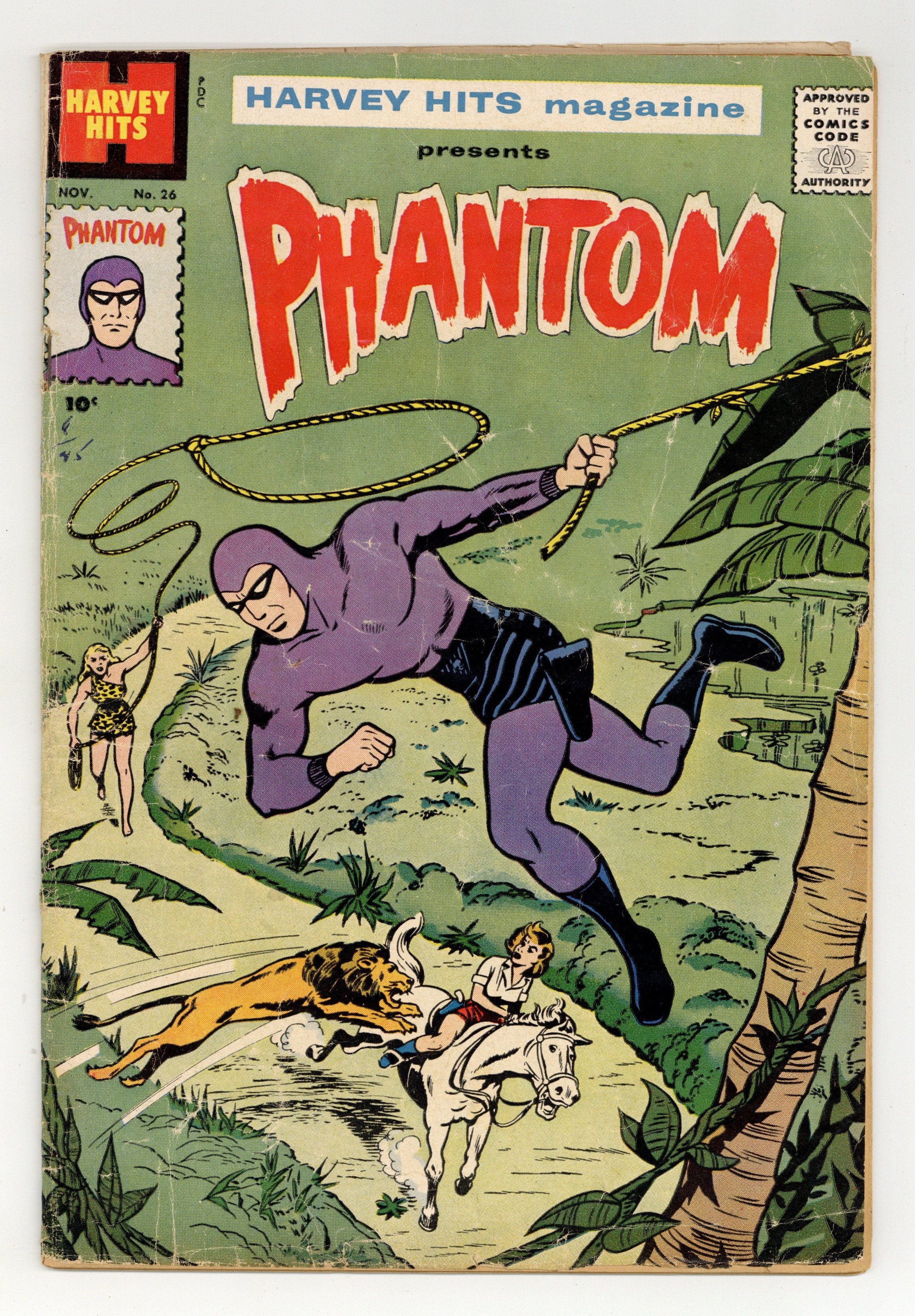 $40.00Cover by Joe Simon. Stories and art by Lee Falk and Wilson McCoy. A showcase anthology that launched many of Harvey's long-running titles. This issue features reprints of Lee Falk's Phantom comic strip. The Phantom goes undercover on a wilderness road to investigate attacks by a wild girl, but he didn't reckon on her pet lion. Adventure of the Wild Girl!; Ned Hall of the Foreign Legion. 32 pages, Full Color. Cover price $0.10.