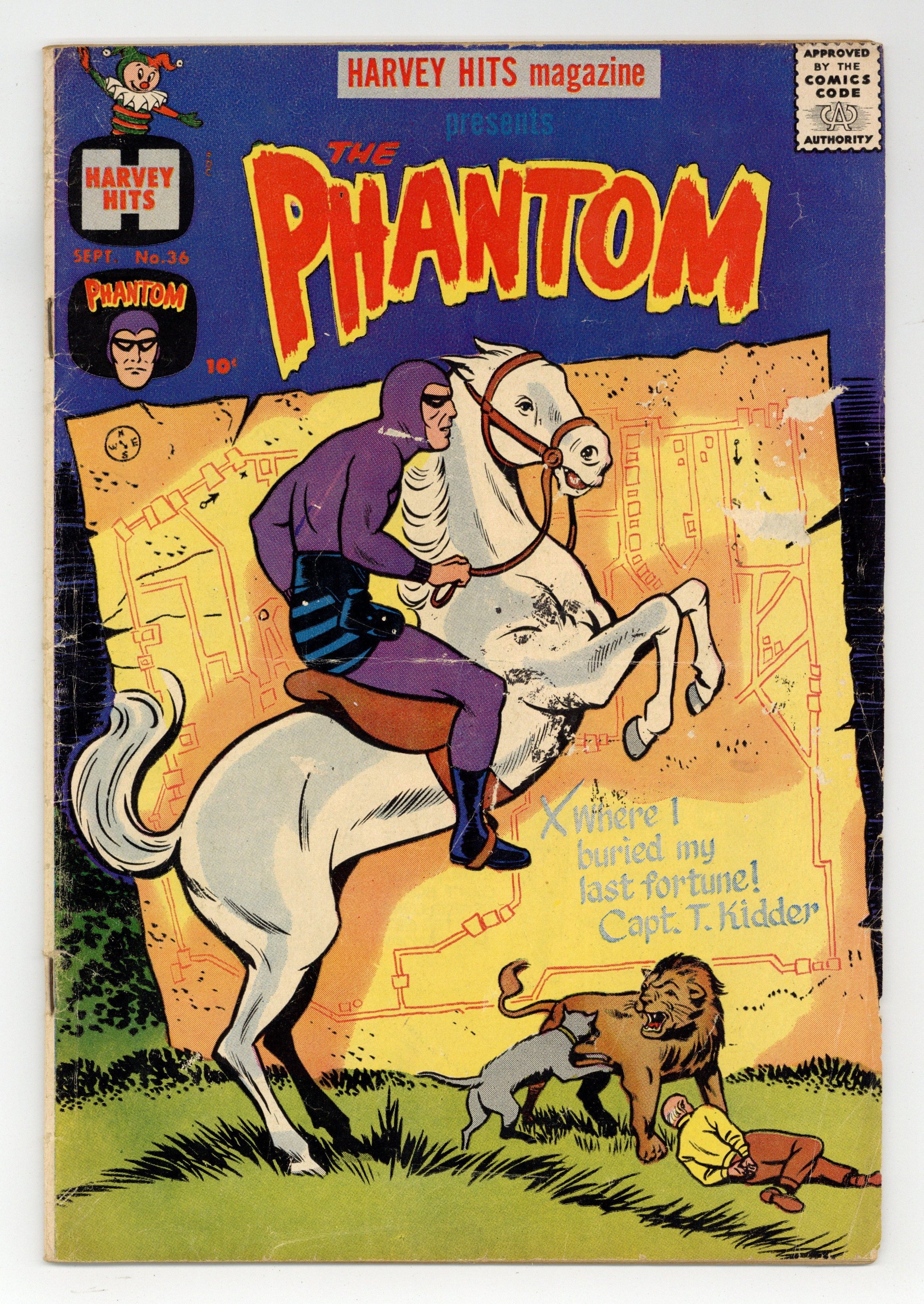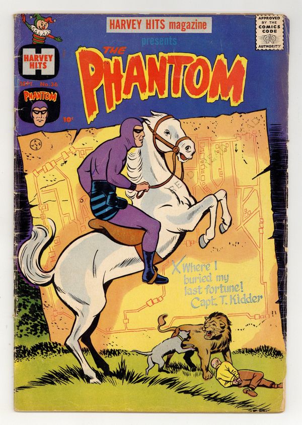 $23.00Cover by Joe Simon. Stories and art by Lee Falk and Wilson McCoy. A showcase anthology that launched many of Harvey's long-running titles. This issue features reprints of Lee Falk's Phantom comic strip. Gangsters and gamblers get involved in the archaeological search for an ancient pirate city, so the Phantom decides he'd better intervene. Plus how-to articles on cowboy life. The Secret of the Lost Treasure City!; Dangerous Mission; True Stories of Famous Dogs; How to Make Your Spinning Rope; How to Ride a Horse; Fearless Rough-Rider. 32 pages, Full Color. Cover price $0.10.