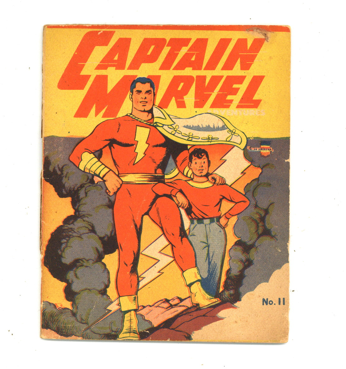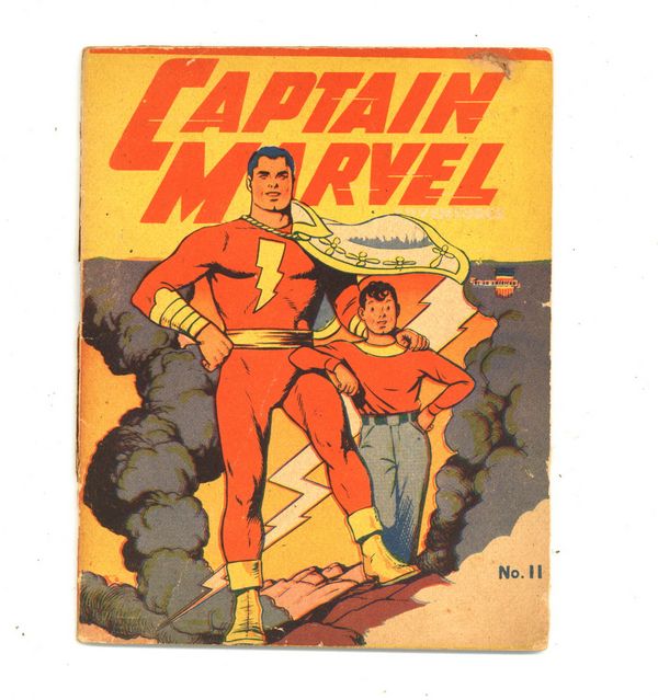 Published 1942 by Samuel Lowe Co..$166.00Variant with blank back cover or back cover with a b&w war bonds stamp logo (no color on back). Reprint of two Captain Marvel stories in a smaller booklet format. Stories include "Captain Marvel and the Bumble-Brained Bridegroom" and "The Alaskan Adventure." Newsprint cover and interior, 5" X 4", 36 pages in black, white, and red. Listed as Mighty Midget Comics in Overstreet.