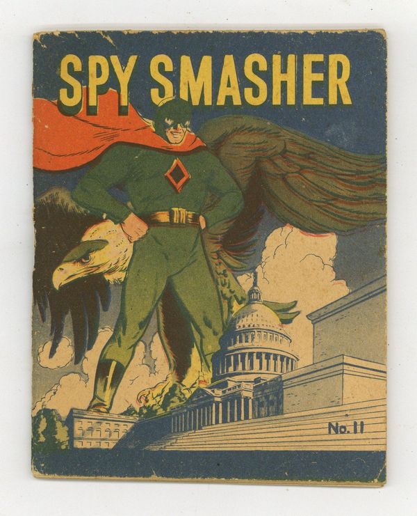 Version with War Bond stamp on an otherwise blank back cover. Spy Smasher stars in "Once a Navy Man, Always a Navy Man," "Virginia, Mother of Fighting Americans," and "The Island of Whanno!" This comic measures approximately 5" X 4" and features 34 pages in black, white, and red. Also features full color cover. Listed as Mighty Midget Comics in Overstreet.