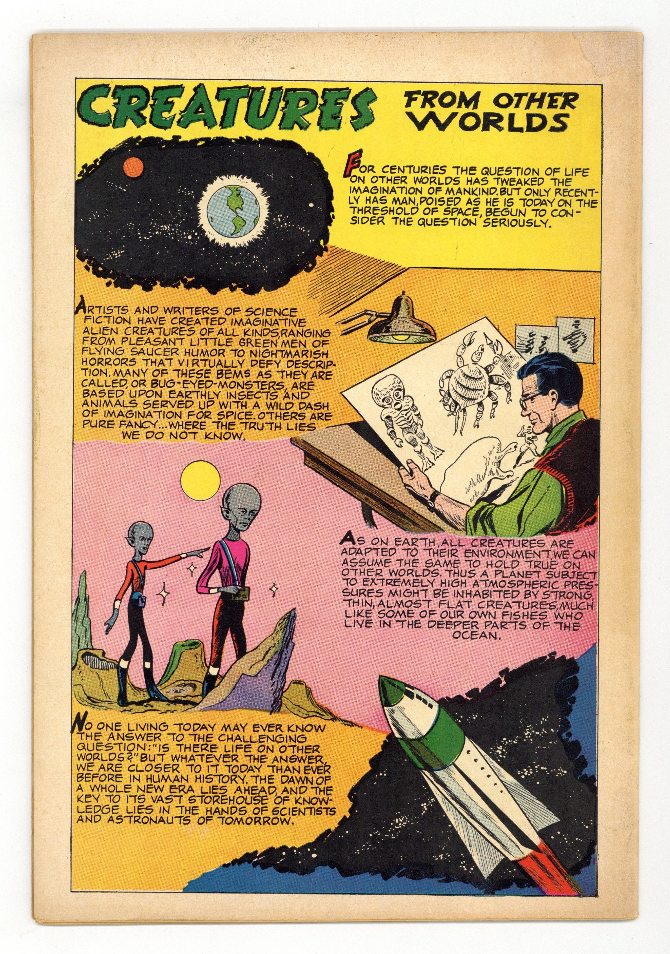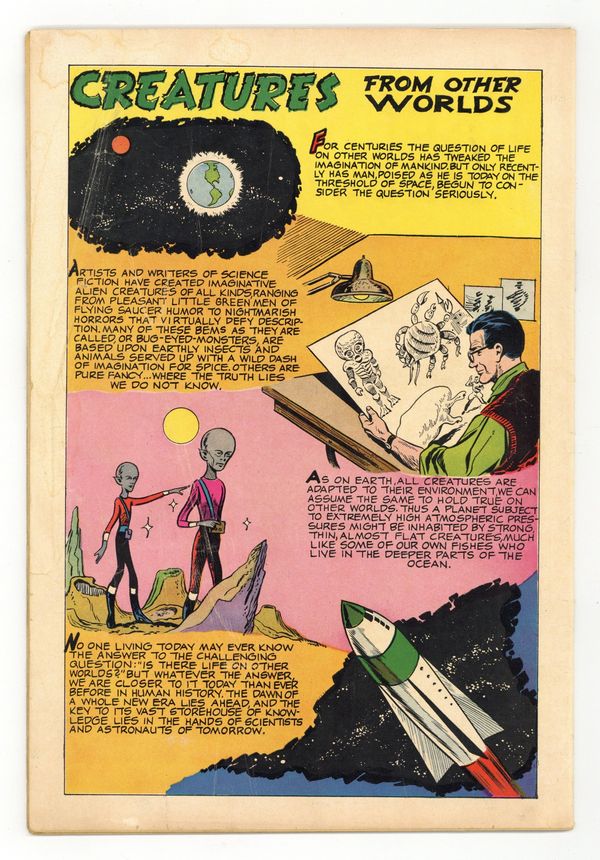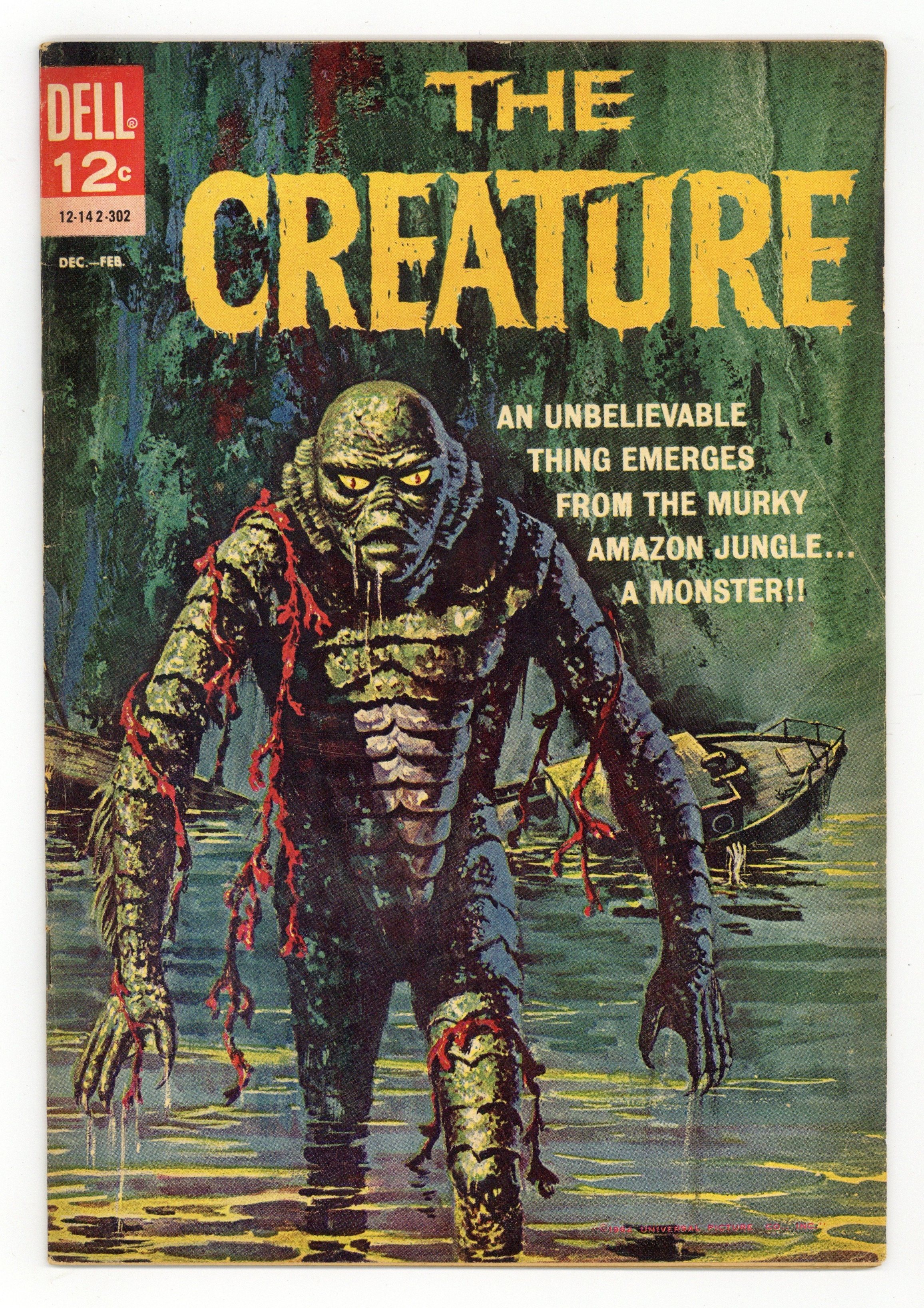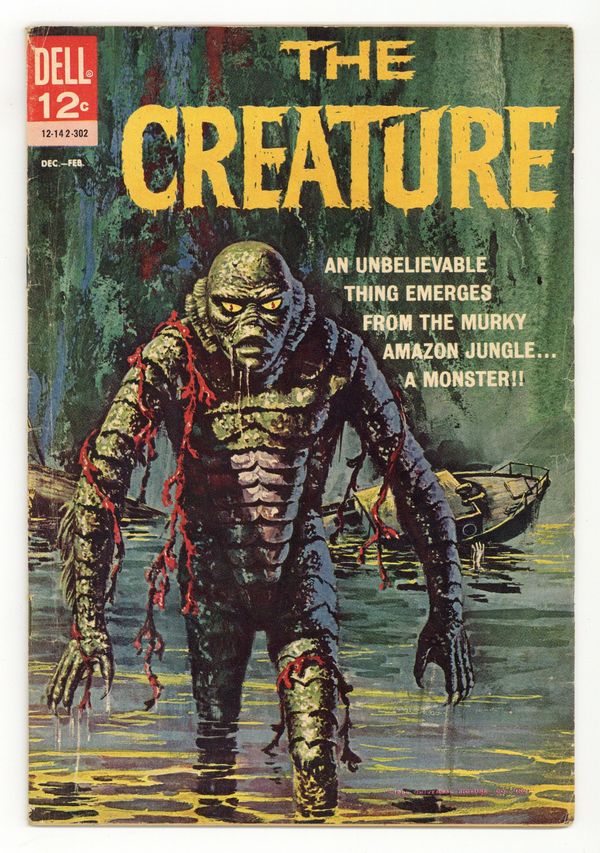 First printing (#12-142-302). Painted cover by Vic Prezio. Art by Jack Sparling and others. A tale of horror from Dell, inspired by the classic Universal Monster movie The Creature from the Black Lagoon. Scientists investigating the strange fossil of a webbed humanoid hand travel upriver to the headwaters of the Amazon. There, they find their expedition hindered by a wealthy playboy, Nazi war criminals, and a still-living Creature. Plus a look at other monsters from myth and history. Considered part of Dell's Movie Classics line, although not listed as such on the cover. Medusa the Gorgon; Creature from the Amazon; Prehistoric Birds; Creatures from Other Worlds. 32 pages, Full Color. Cover price $0.12.