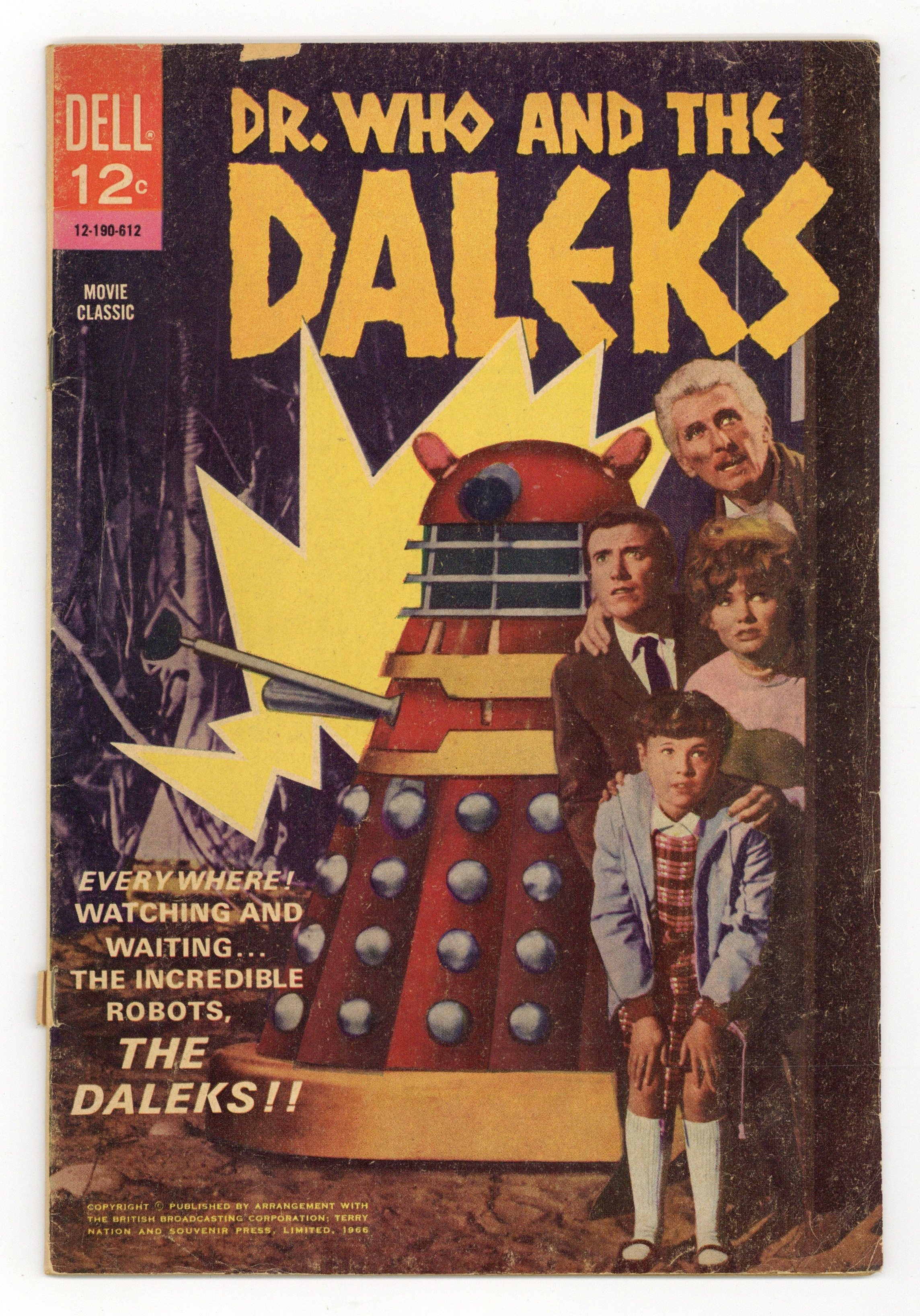 Photo cover features Peter Cushing, Roy Castle, Jennie Linden and Roberta Tovey. Story by Joe Gill, based on the screenplay by Milton Subotsky and Terry Nation. Art by Dick Giordano and Sal Trapani. Cover number is #12-190-612. Dell Movie Classics presented comics based on Hollywood films (not all of them classics). This issue is based on the 1965 Amicus production Dr. Who and the Daleks, a film based on the British TV series, which was then in its infancy. Canon is broken from panel one, as eccentric inventor "Dr. Who" builds his homemade time machine, the Tardis, in his back yard. Dr. Who (portrayed by Peter "Grand Moff Tarkin" Cushing in the film) is aided by his plucky grandchildren to battle the robot army of the Daleks through time. Noteworthy as the first authorized appearance of any form of the Doctor Who franchise in the American market. 32 pages, Full Color. Cover price $0.12.