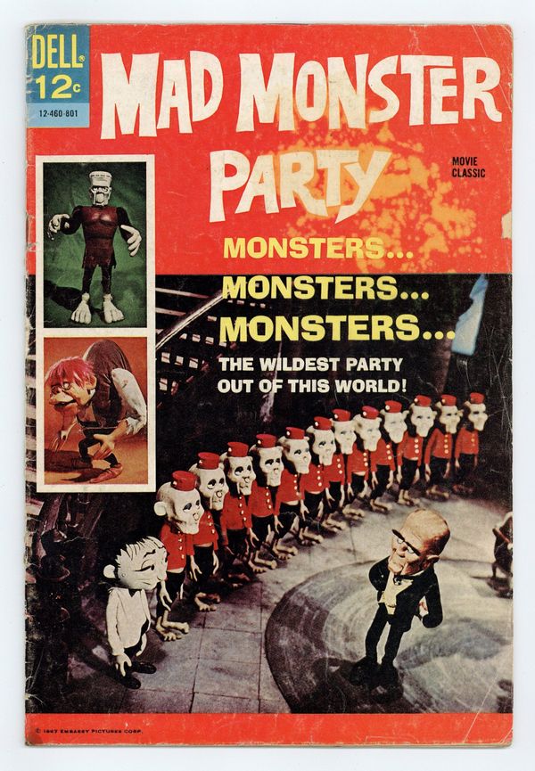 A real rarity for horror and animation fans. A comics adaptation of the 1967 animated special from Rankin-Bass, which starred Boris Karloff. MAD legends Harvey Kurtzman and Jack Davis were involved in the film's story and design, both of which the adaptation follows closely. A page of film credits (including Kurtzman's) is illustrated with movie stills. Baron Frankenstein has decided to retire, and invites all the other monsters to a banquet at his remote island castle. But when long-lost nerdy nephew Felix Franken is appointed Frankenstein's successor, a power struggle leads to monster-sized comedic chaos. 32 pages, Full Color. Cover price $0.12.