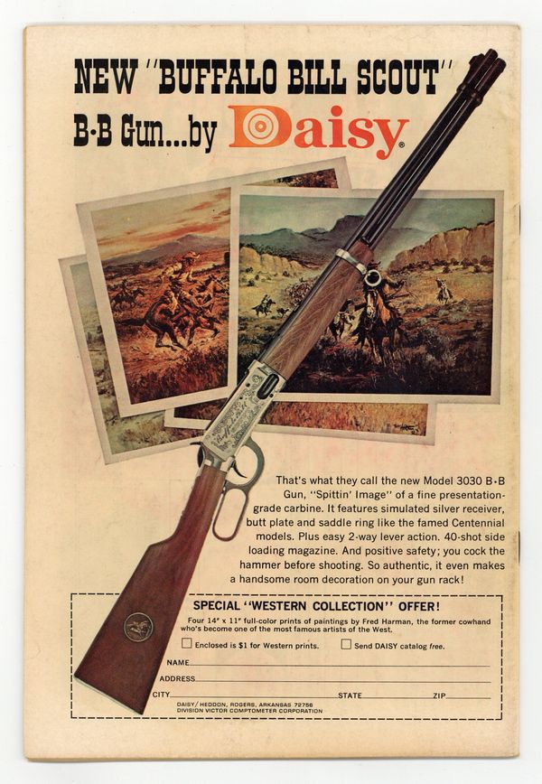 Cover by Frank McCarthy. Art by Jack Sparling. Cover number is #01-880-912. Dell Movie Classics presented comics based on Hollywood films (not all of them classics). This issue is based on the 1969 sci-fi Western produced by Charles H. Schneer and Ray Harryhausen. It's cowboys vs. dinosaurs, a combination that will make any little kid's heart jump for joy. When cowboys explore the Forbidden Valley in Mexico at the turn of the 20th century, rodeo cowgirl TJ and stuntman Tuck are startled to find prehistoric creatures. Efforts to capture creatures for the circus unleash Gwangi, an allosaurus who then runs amok in the streets of the town. The original film had effects by the great Ray Harryhausen, and was conceived by Harryhausen's mentor, Willis O'Brien of King Kong fame. Cover from the movie poster by Frank McCarthy. 32 pages, Full Color. Cover price $0.15.